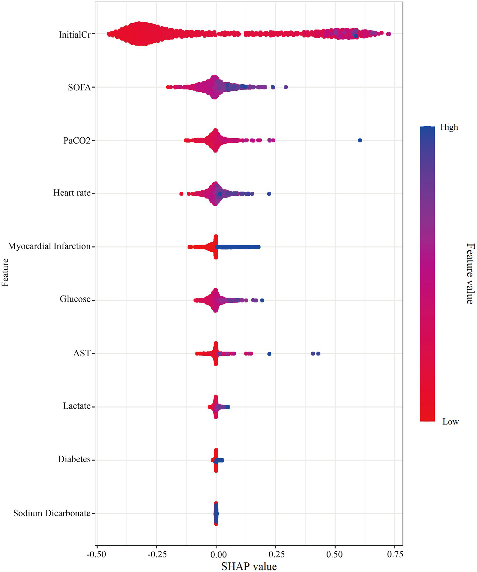 The following variables were initially collected: Demographics: Sex, age. Physical parameter: Body mass index (BMI). Medical history: Hypertension, diabetes, heart failure, myocardial infarction, cerebral infarction, chronic obstructive pulmonary disease (COPD), cirrhosis, cancer, chronic renal failure (CRF). Blood markers: Alanine aminotransferase (ALT), aspartate aminotransferase (AST), total bilirubin (TBil), blood urea nitrogen (BUN), glucose, sodium (Na), potassium (K), chloride (Cl), calcium (Ca), prothrombin time (PT), international normalized ratio (INR), initial serum creatinine (InitialCr), lactate (Lac), albumin. Blood cell counts: Hemoglobin, white blood cell count (WBC), platelet count (PLT). Interventions: Percutaneous coronary intervention (PCI), extracorporeal membrane oxygenation (ECMO), continuous renal replacement therapy (CRRT), intra-aortic balloon pump (IABP), targeted temperature management (TTM), mechanical ventilation. Blood gas analysis: Partial pressure of oxygen (PaO2), partial pressure of carbon dioxide (PaCO2), PH, bicarbonate (HCO₃−), base excess. Scoring systems: Charlson Comorbidity Index, Glasgow Coma Scale (GCS) score, Sequential Organ Failure Assessment (SOFA) score. Vital signs: Heart rate (HR), mean systolic blood pressure (SBP), mean diastolic blood pressure (DBP), mean arterial pressure (MAP), respiratory rate (RR), temperature. Medications: Vasoactive drugs, sodium bicarbonate, glucocorticoids, antiarrhythmic drugs. In total, 53 variables were recorded. Serum creatinine levels were also measured at 24 and 48 h after ICU admission to assess acute kidney injury according to KDIGO criteria.