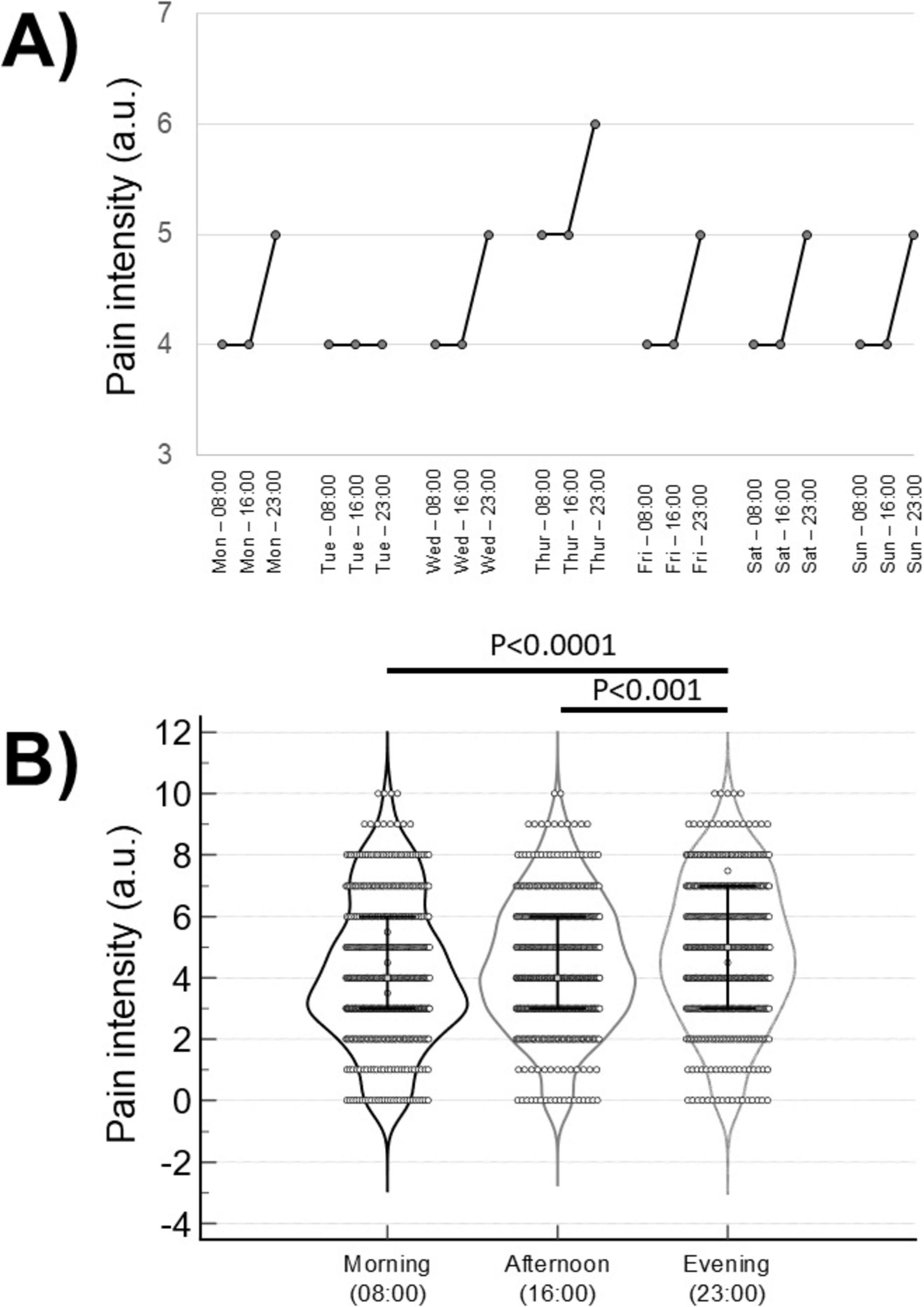 Figure 1. (A) Time course (over a 7-d period) of the median pain intensity, assessed using a 0–10 numerical rating scale, self-reported thrice (at 8:00, 16:00, and 23:00) daily. (B) Violin plots of the pain intensity self-reported thrice (at 8:00, 16:00, and 23:00) daily (data of different days were pooled). Error bars indicate the median values and the interquartile ranges.