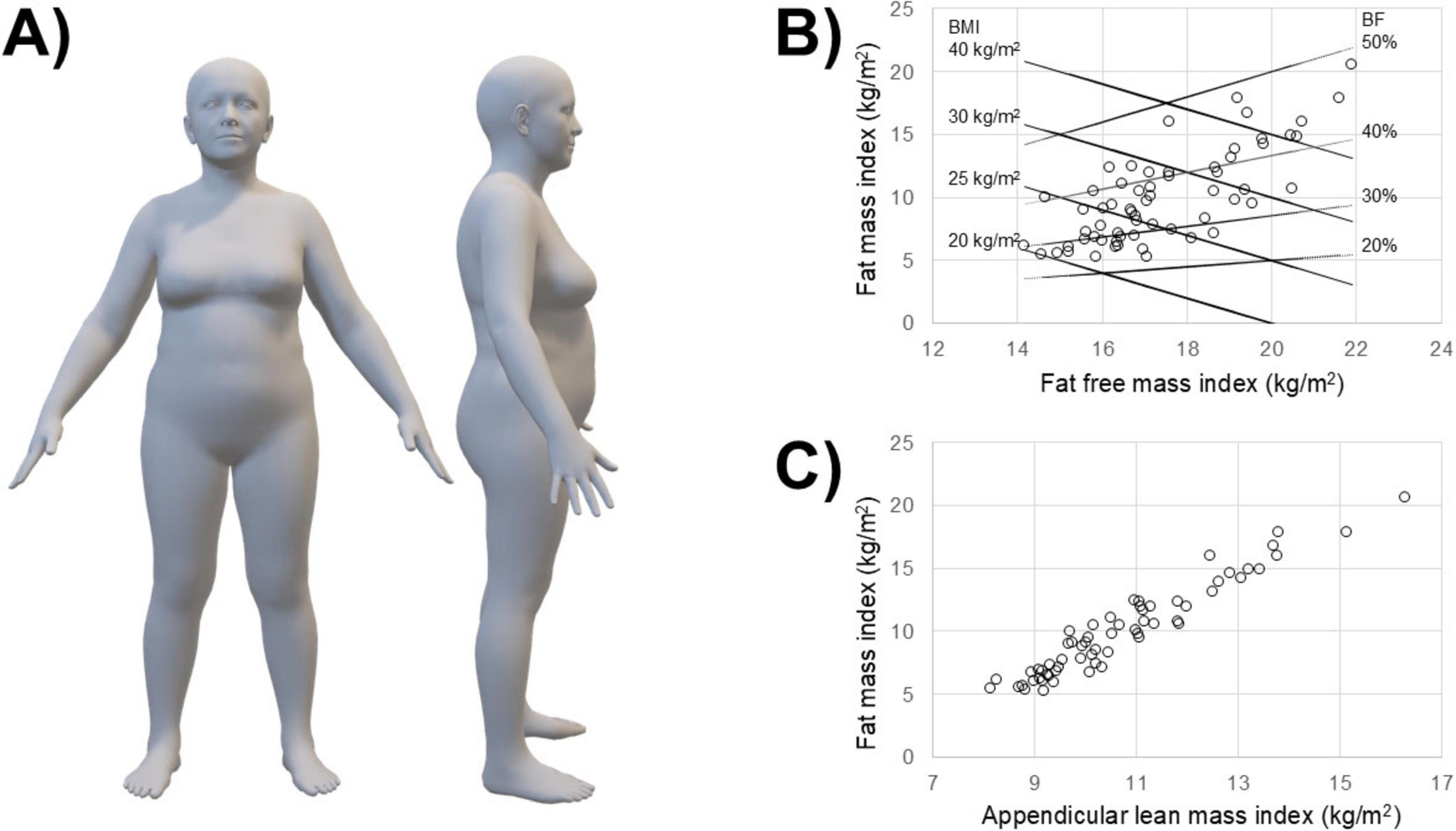 Figure 3. Average body shape of the 62 patients (A) and body composition charts showing individual values (B,C): lines representing body mass index (BMI: continuous black lines) and body fat percentage (BF%: dotted black lines) are included in panel (B).