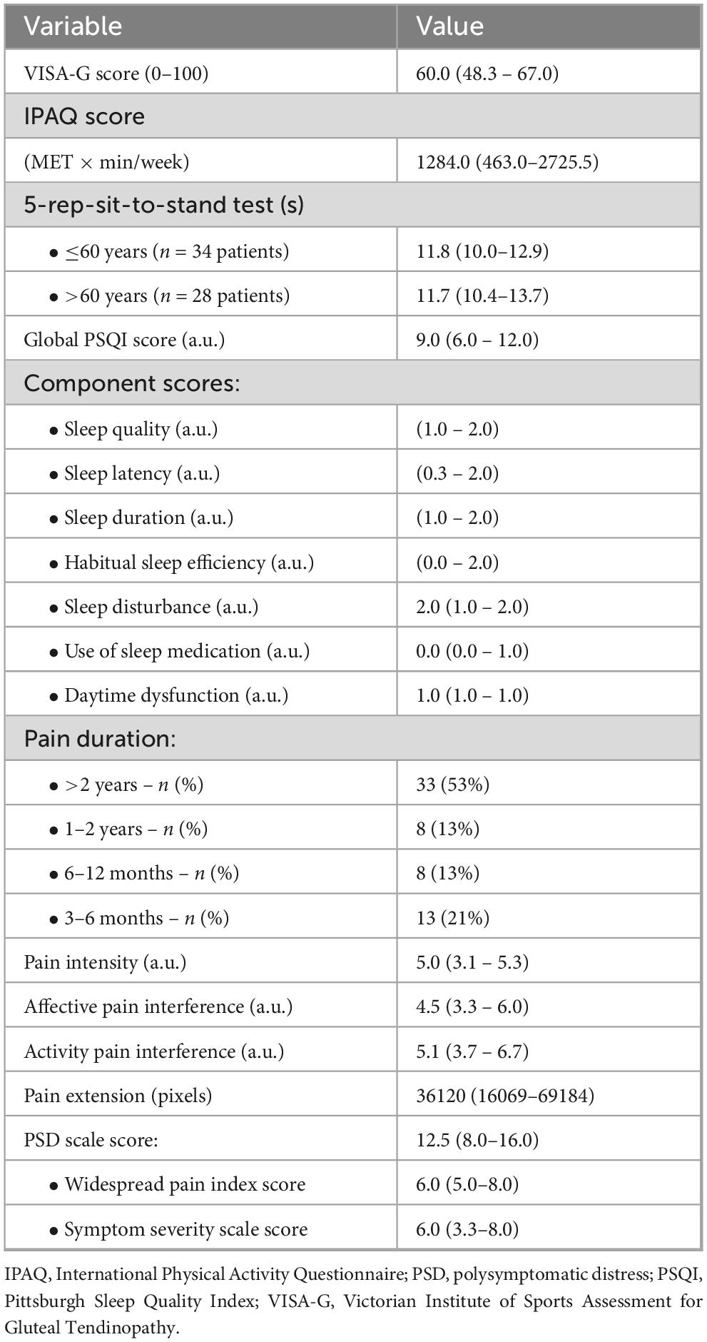 Table 1. Median (1st–3rd quartile) values of the results of the clinimetric and physical performance assessments obtained in the whole group of 62 patients.