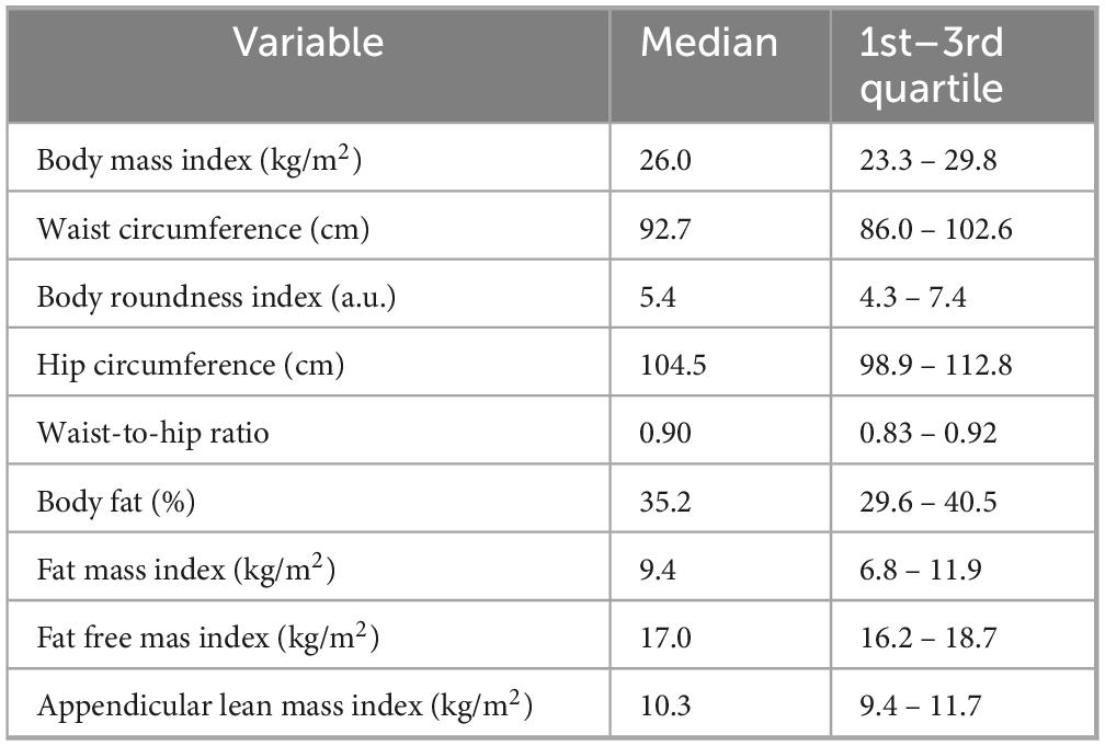 Optical images were taken with ProScanner device (version 5.0, Fit3D, Sacramento, CA, USA), using a standardized protocol, as previously described (32). Briefly, each patient was asked to stand upright in a standardized A-pose (with shoulder relaxed and arms positioned straight and abducted from the torso) while grasping the telescoping handles. A full body scan takes ∼ 45 s during which light-coding depth sensors capture the tri-dimensional shape as the platform rotates once around. The acquisition of the tri-dimensional shape was performed in duplicate to obtain two avatars for each patient. Each avatar consists in a mesh connected by triangles with approximately 300,000 vertices and 600,00 faces to represent body shape. The raw mesh files were digitally registered and reposed using Meshcapade (Meshcapade GmbH, Tübingen, Germany) (33, 34) to obtain the average avatar for the whole sample of patients (see section “3. Results”). Along with the mesh, the Fit3D dashboard provides also for each avatar a large number of anthropometric measurements (i.e., whole-body and segmental circumferences, lengths, surface areas, volumes) and body composition estimates. The following body size, shape, and composition variables obtained by proprietary algorithms were considered (data obtained for the two avatars were averaged): body mass index, waist circumference, hip circumference, waist-to-hip ratio, body fat percentage, fat mass index and fat free mass index (i.e., fat mass and fat free mass scaled to height squared, respectively). Moreover, appendicular lean mass index (i.e., sum of the soft lean tissue in the arms and legs scaled to height squared) and body roundness index (i.e., an index combining waist circumference and height that can range between 1 and 20, where 1 represents more narrow body types and 20 represents more round body types: the healthy range is about 4–5) were obtained according to previously published equations (Supplementary Table 1) (35, 36). In a female population, waist circumference ≥88 cm and waist-to-hip ratio >0.85 can be considered indicative of increased waist circumference and central obesity, respectively, (37) while fat mass index >9 kg/m2 indicates excess fat (38) and appendicular lean mass index <5.45 kg/m2 is a proxy for low muscle mass (39).