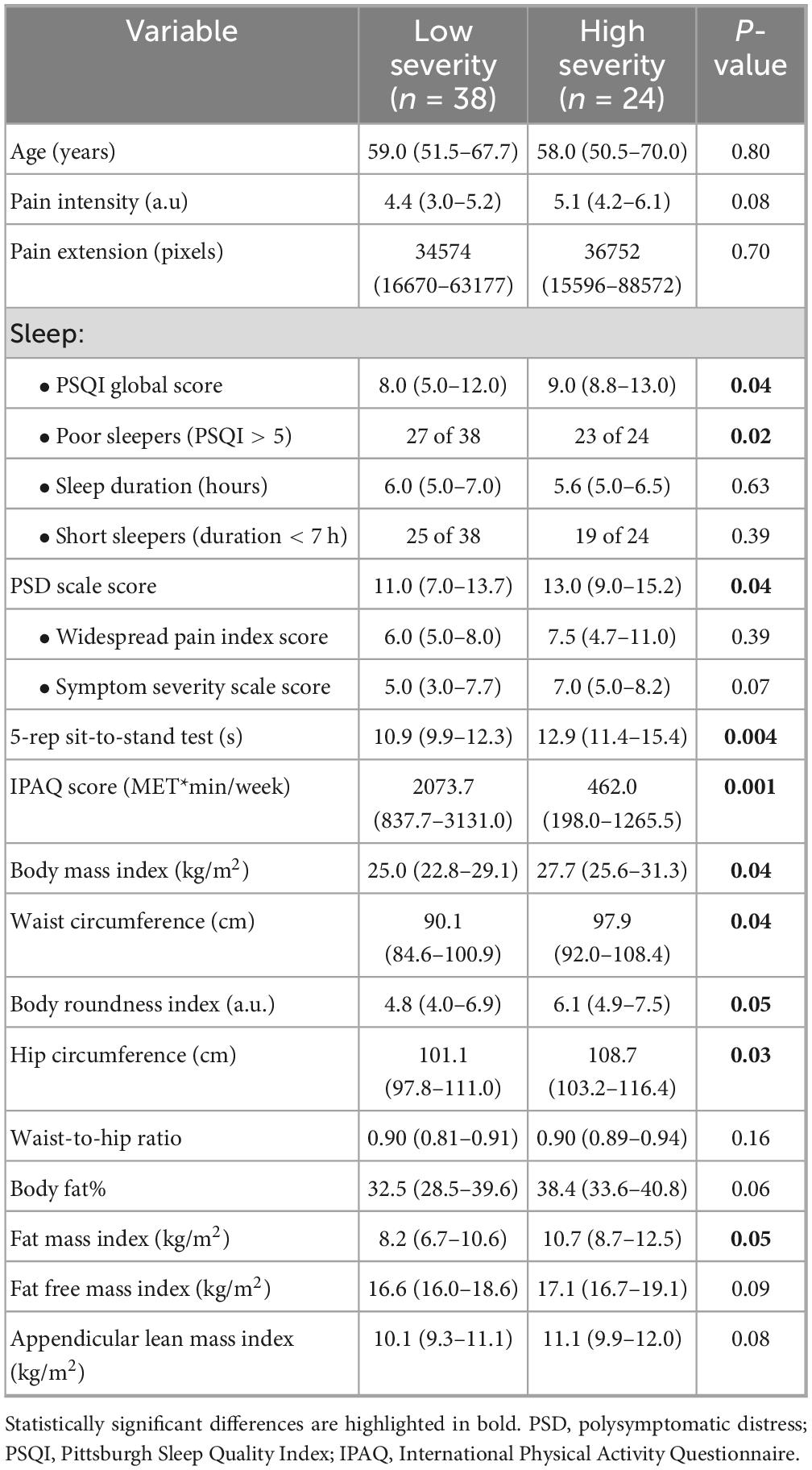 Table 3. Median (1st–3rd quartile) values of the results of the clinimetric, pain phenotype, anthropometric, body composition, and physical performance assessments obtained in the two subgroups of patients with low (38 patients) and high (24 patients) severity of tendinopathy-related disability.