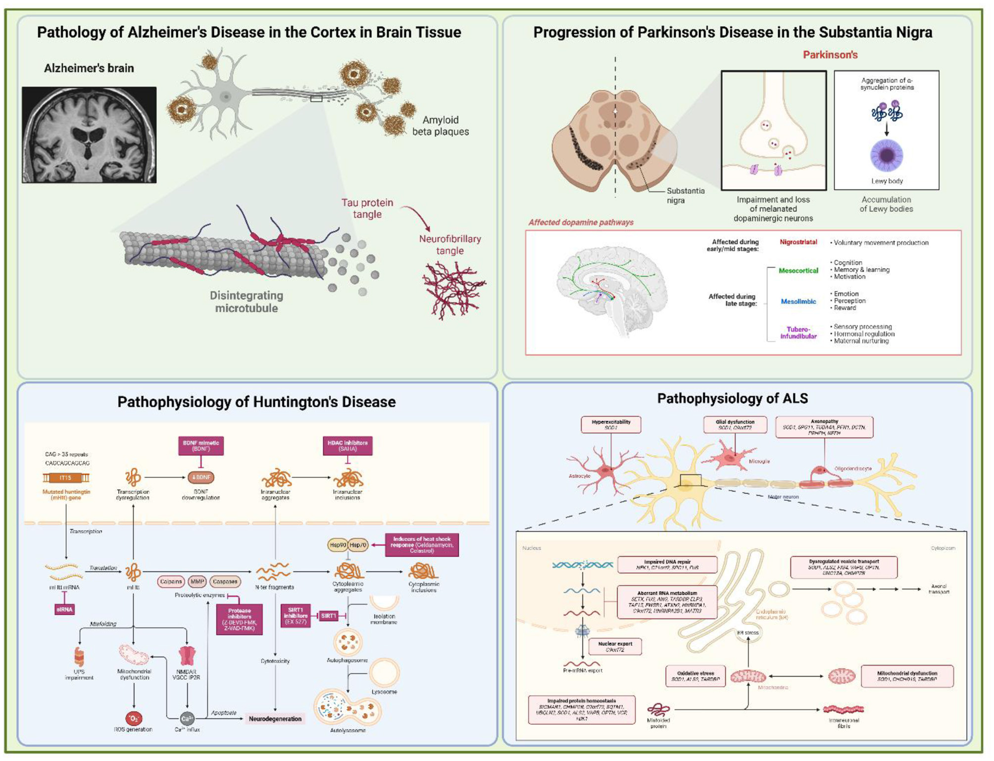 AD is pathologically defined by extracellular β-amyloid (Aβ) deposition and intracellular accumulation of hyperphosphorylated tau protein, particularly in cortical and hippocampal regions. In contrast, PD is marked by dopaminergic neuronal loss in the substantia nigra and basal ganglia, resulting in both motor and non-motor symptoms. While AD and PD account for most neurodegenerative diagnoses globally, HD and ALS—though less common—present distinct pathophysiological mechanisms that are now being investigated using gene and cell-based approaches (3, 4) (Figure 1).