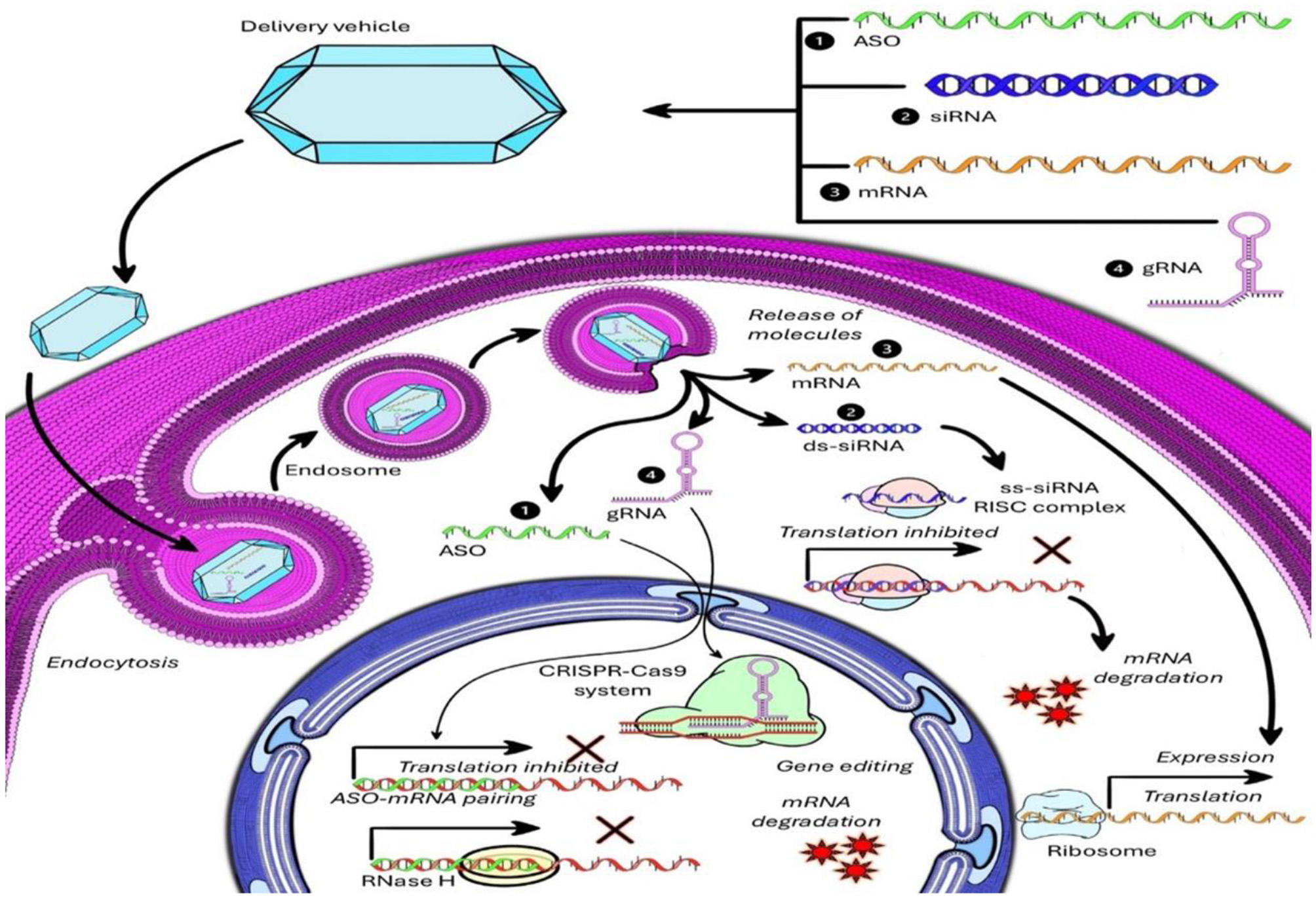A schematic representation of intracellular delivery and gene modulation mechanisms of antisense oligonucleotides (ASO), small interfering RNA (siRNA), messenger RNA (mRNA), and guide RNA (gRNA) via a nanoparticle-based delivery system. The illustration demonstrates the journey and mechanisms of different nucleic acid-based therapeutics after their delivery into a target cell using a nanocarrier system. Delivery vehicle and cellular entry: a synthetic nanoparticle-based delivery vehicle encapsulates therapeutic molecules including ASO (green), siRNA (blue), mRNA (orange), and gRNA (pink). The delivery system undergoes endocytosis upon interacting with the cellular membrane, forming an endosome that facilitates internalization. Endosomal escape and cytoplasmic release: the nanoparticles escape the endosome, releasing their nucleic acid cargo into the cytoplasm, where the therapeutic actions are initiated. Mechanisms of action: (1) Antisense Oligonucleotide (ASO): single-stranded ASO binds to target mRNA via complementary base pairing. This pairing either inhibits translation directly by blocking ribosome binding or induces mRNA cleavage mediated by RNase H, leading to mRNA degradation and suppressed gene expression. (2) Small Interfering RNA (siRNA): double-stranded siRNA (ds-siRNA) is processed into single-stranded siRNA (ss-siRNA) and incorporated into the RNA-induced silencing complex (RISC). The RISC-siRNA complex binds to complementary mRNA, causing translation inhibition or mRNA degradation, effectively silencing gene expression. (3) Messenger RNA (mRNA): delivered mRNA is released in the cytoplasm and directly used by ribosomes for translation into functional proteins, thus promoting gene expression. (4) Guide RNA (gRNA) in CRISPR-Cas9 system: through base pairing, the gRNA guides the Cas9 endonuclease to a specific genomic locus. This enables gene editing through site-specific DNA cleavage, followed by either gene disruption or correction. The gRNA-Cas9 complex also contributes to mRNA degradation in some designs or inhibits transcription if used with catalytically inactive dCas9 fused to transcription repressors. The outcomes of these mechanisms result in either suppression (via ASO, siRNA, or CRISPR) or induction (via mRNA, or CRISPR) of gene expression, contributing to therapeutic effects tailored for diseases such as cancer, viral infections, and genetic disorders. Application of ASO is not limited to inhibition only (84).