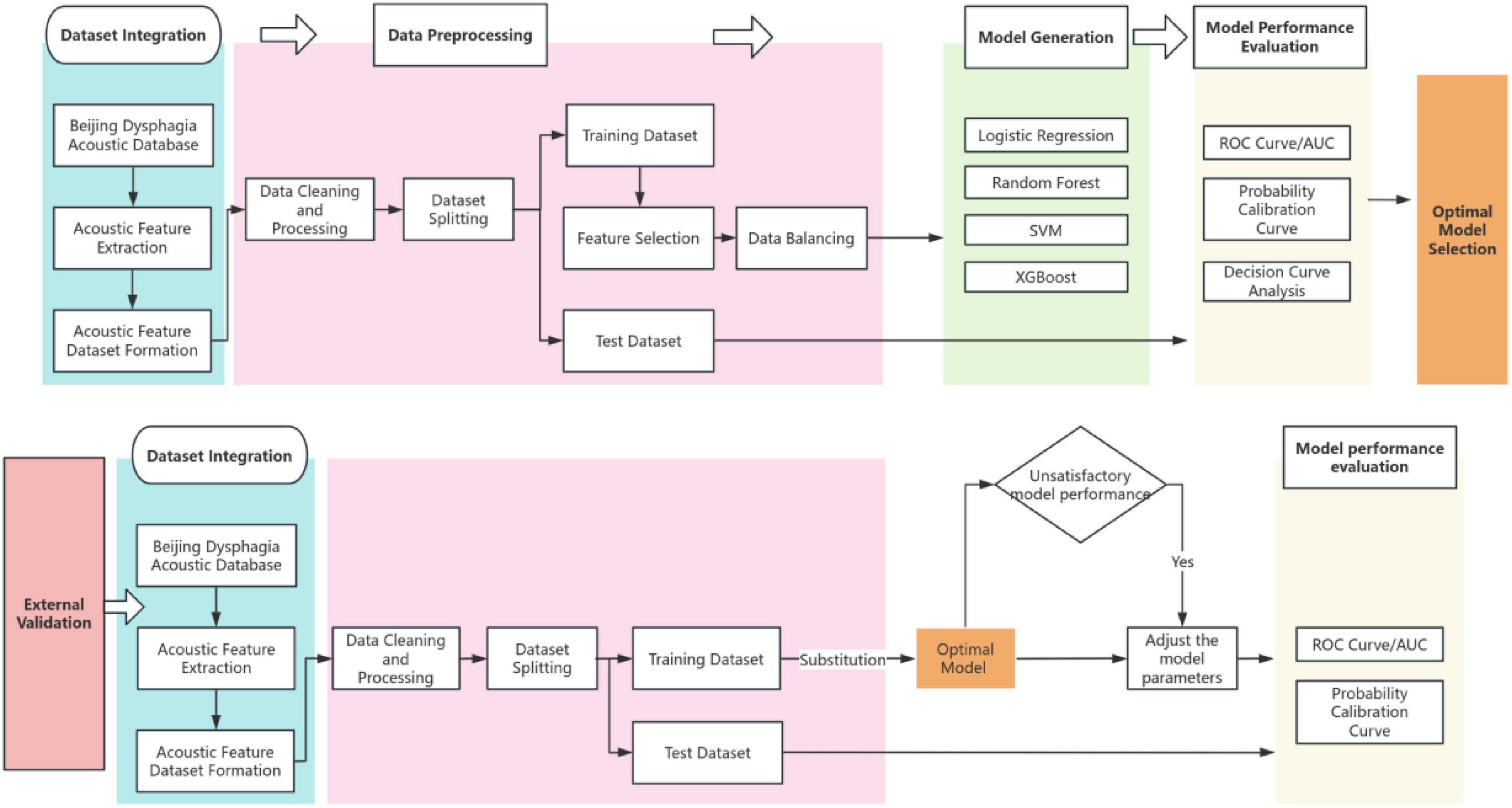 Methods: Adhering to TRIPOD guidelines, we conducted a study in three stages: variable screening, model construction, and evaluation. Audio data (voice, cough, swallow) were collected from the elderly in nursing homes. A modeling dataset (Beijing area, n = 419) was used to screen key features via LASSO regression. Models were built using Logistic Regression, Random Forest, SVM, and XGBoost, with performance evaluated on an internal test set. The best-performing model was subsequently validated on an external dataset (Shijiazhuang area, n = 216).