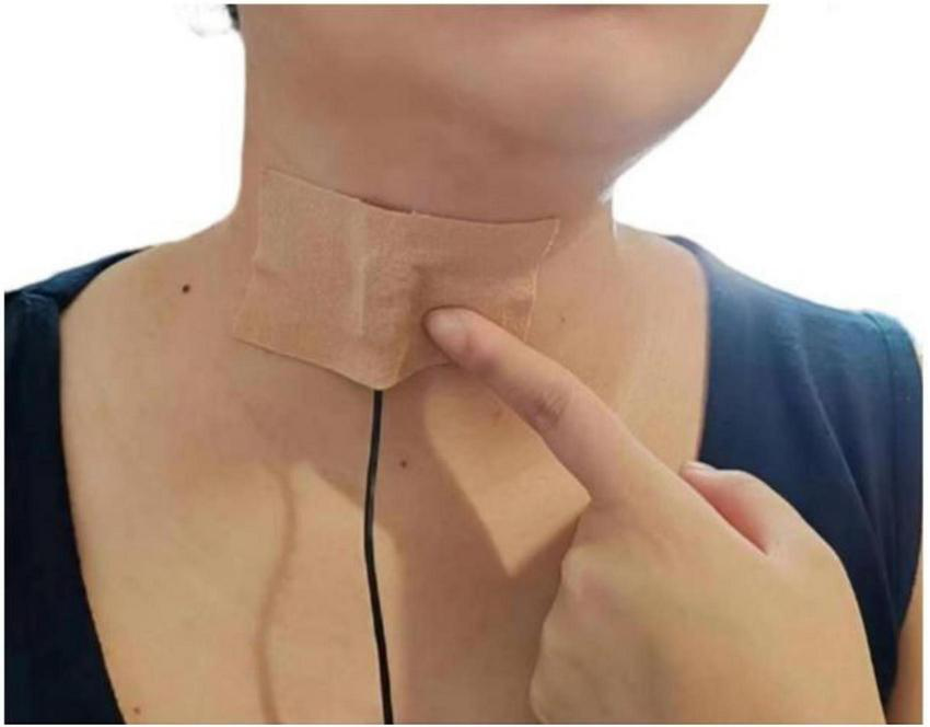 All audio was recorded on-site in isolated rooms within the nursing homes to ensure acoustic fidelity. We used a contact microphone (C411L, AKG) affixed inferior to the cricoid cartilage (35, 36) (Figure 2) and connected to a digital recorder (Portacapture X8, TASCAM) configured at a 44.1 kHz sampling rate and 24-bit depth. Participants were positioned in a standardized seated posture with their backs fully supported against the chair backrest, feet flat on the floor, and knees flexed at approximately 90 degrees to ensure stability. The head and neck were maintained in a neutral position throughout recording, and participants were instructed to avoid head movements to maintain consistent microphone placement and signal integrity. The recording protocol included: (1) A 10-s baseline ambient noise capture; (2) A series of predefined vocal, swallowing, and cough tasks performed sequentially (detailed in Supplementary Table 1); (3) A concluding 10-s ambient recording.