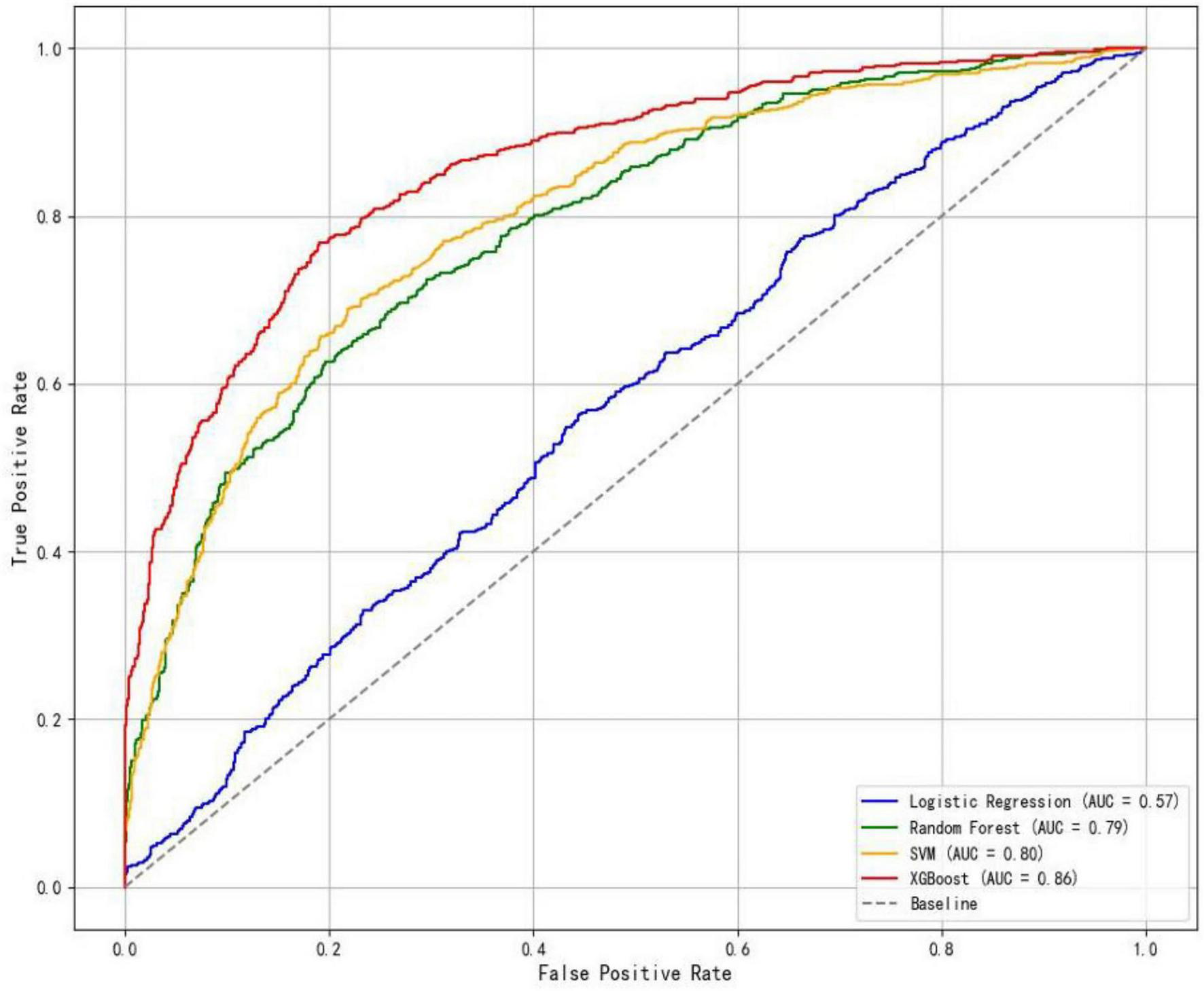 The XGBoost model demonstrated superior performance, with an area under the curve (AUC) of 0.86 in internal validation and an AUC of 0.71 in external validation, showing good discrimination, calibration, and clinical utility.