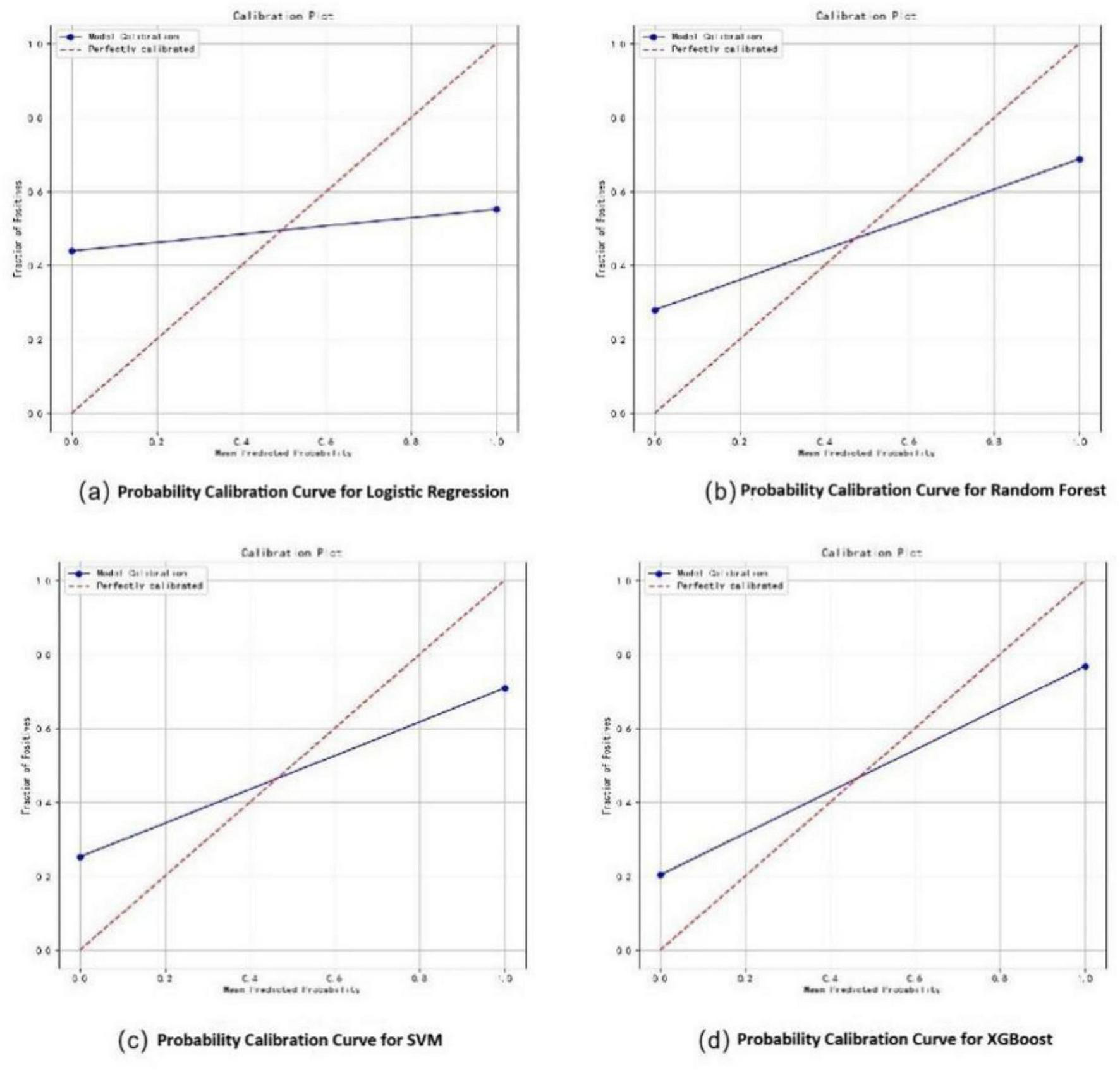 Probability calibration curves for dysphagia recognition models, including Logistic Regression (a), Random Forest (b), SVM (c), and XGBoost (d).
