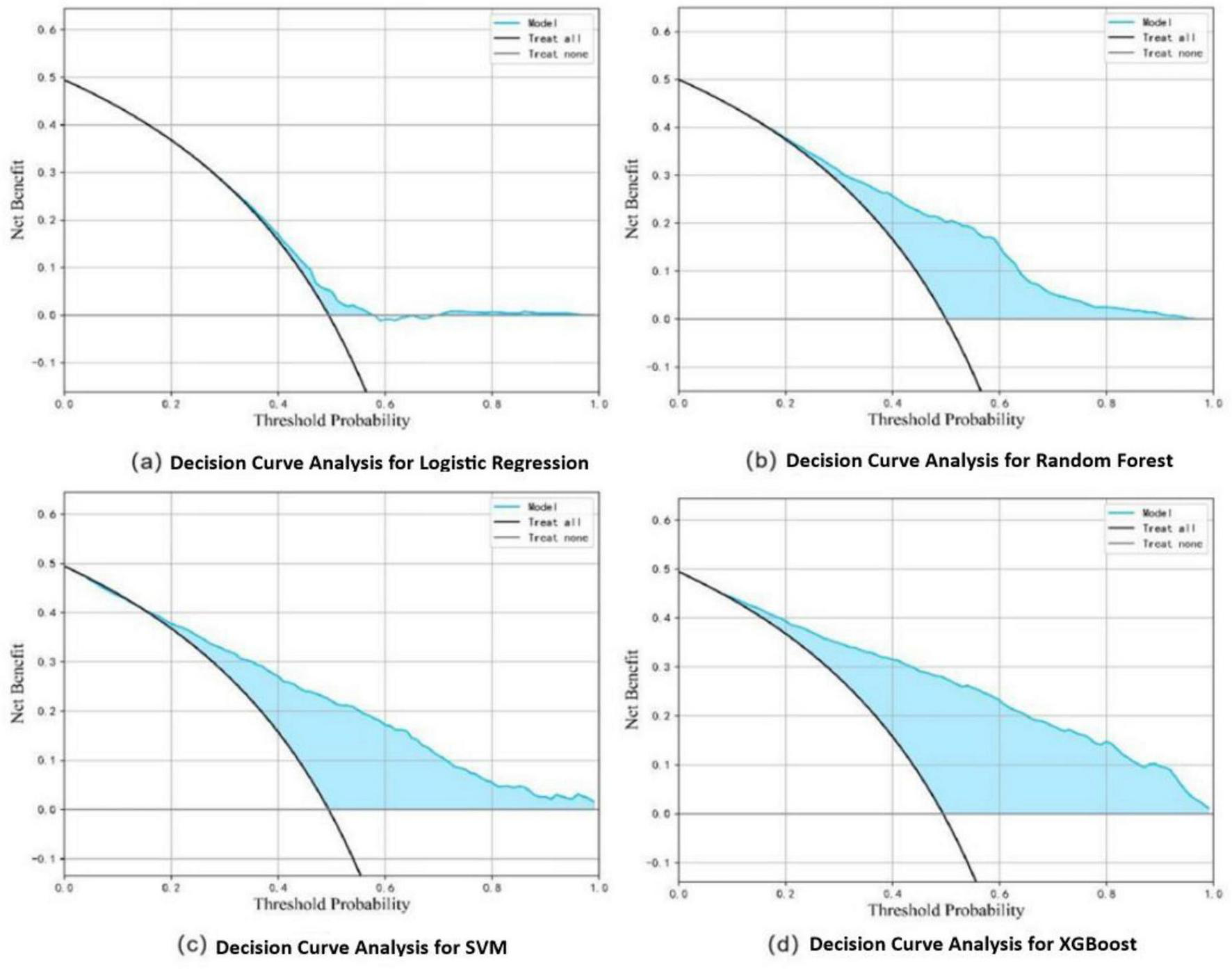 Decision curve analysis for dysphagia recognition models, including Logistic Regression (a), Random Forest (b), SVM (c), and XGBoost (d).