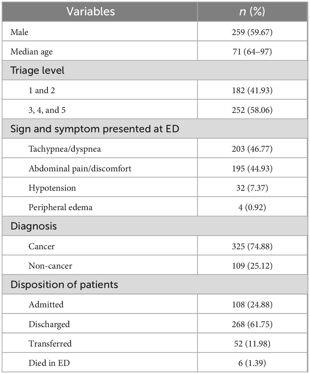 The sample size was determined using the following formula (18). The estimated value for P was based on data from a previously published study (19), leading to the conclusion that a minimum sample size of 340 participants was required. As this was a retrospective study, we included all eligible ED encounters with documented POCUS between January 2020 and December 2024, yielding 434 patients for analysis (exceeding the required sample size), which increases the precision of our estimates. Statistical analysis was performed using SPSS version 27.0 for Windows (SPSS Inc., Chicago, IL, United States), under license from Khon Kaen University. Unless otherwise specified, continuous variables are reported as mean and standard deviation (SD), while categorical variables are presented as number (n) or frequency (percent).