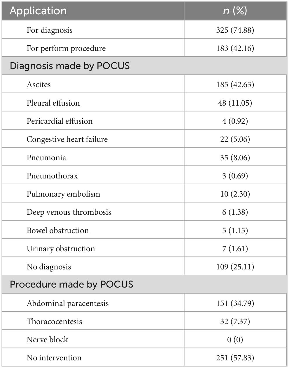 POCUS was primarily used for diagnostic purposes in 325 patients (74.9%). The most common ultrasound-detected findings were ascites in 185 patients (42.6%) and pleural effusion in 48 (11.1%). POCUS-guided procedures were performed in a subset of patients, including abdominal paracentesis in 151 cases (34.8%) and thoracentesis in 32 cases (7.4%) (Table 2).