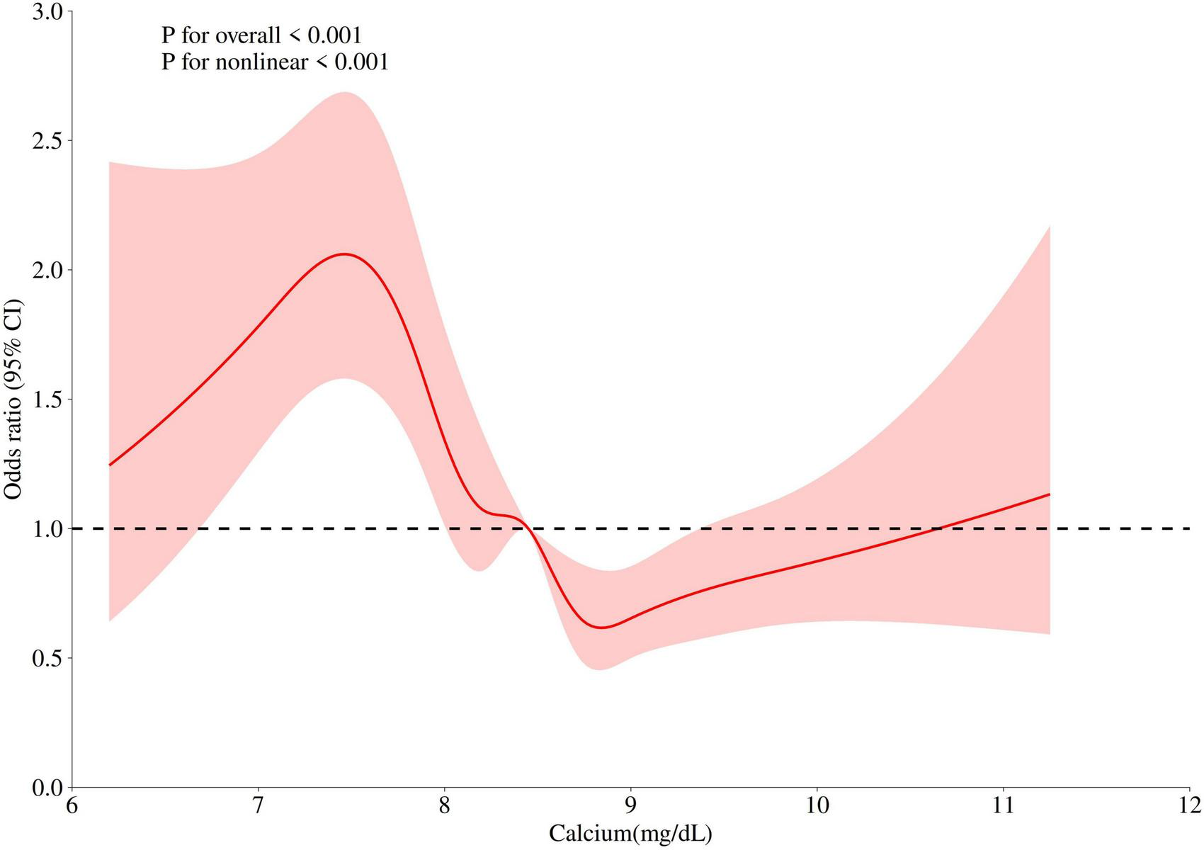 A significant non-linear association was observed between serum calcium levels as a continuous variable and the risk of invasive mechanical ventilation (P < 0.001). Specifically, the restricted cubic spline analysis revealed that when serum calcium levels decreased below 8.45 mg/dL, the risk of IMV progressively increased with declining calcium concentrations (Figure 2).