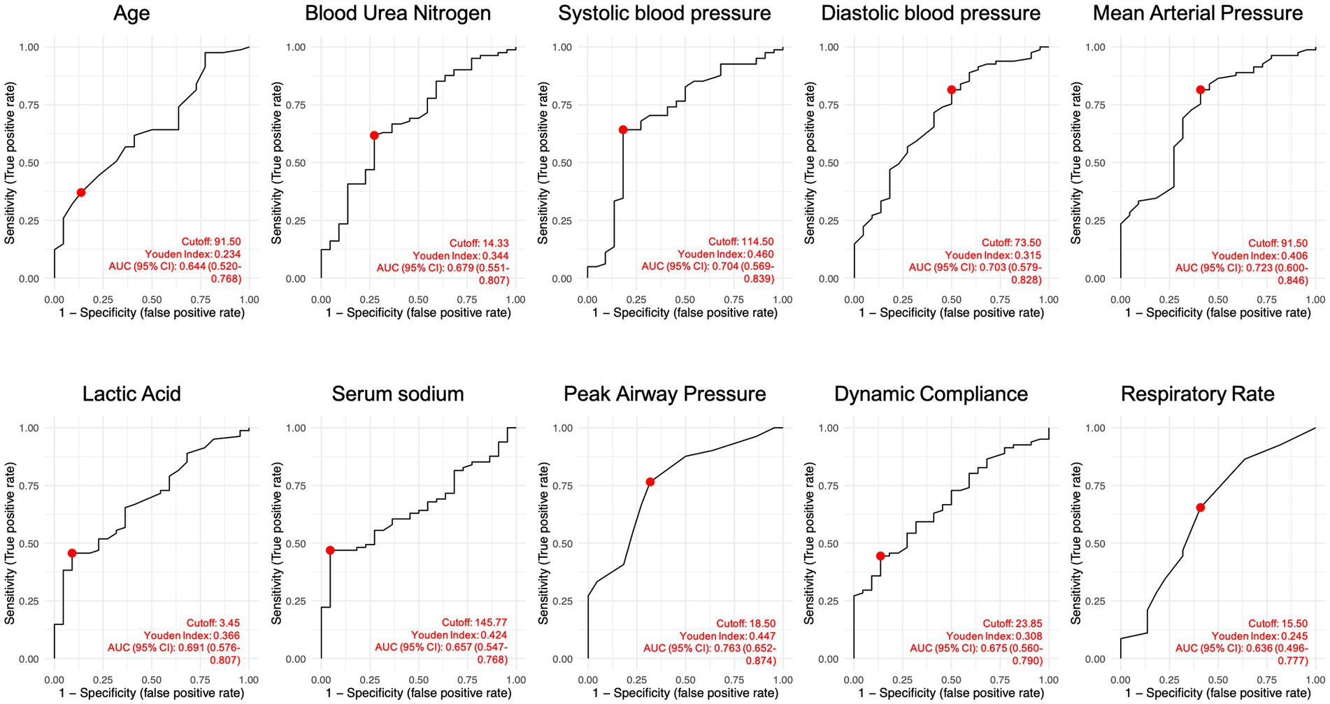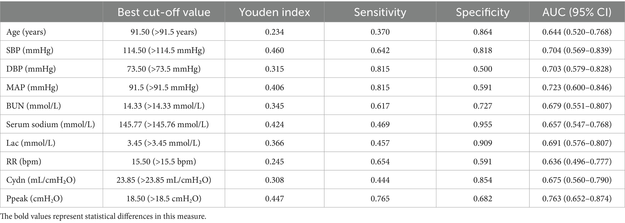 ROC curves showed that continuous variables with statistical significance had predictive value for extubation failure. Using the Youden index, optimal cutoff values were determined as follows: age 91.5 years, SBP 114.5 mmHg, DBP 73.5 mmHg, MAP 91.5 mmHg, BUN 14.33 mmol/L, serum sodium 145.77 mmol/L, lactate 3.45 mmol/L, RR 15.5 bpm, Cydn 23.85 mL/cmH₂O, and Ppeak 18.5 cmH₂O (Table 4 and Figure 1).