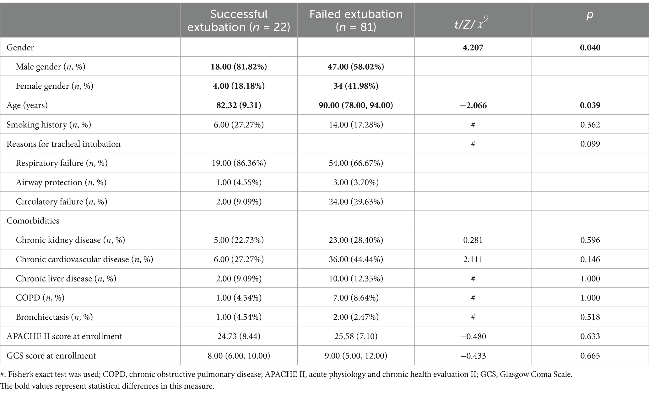 Sex and age: The proportion of males in the failed extubation group was significantly lower than in the successful extubation group (58.02% vs. 81.82%, χ2 = 4.207, p = 0.040), and the failed extubation group was older (90.00 [78.00, 94.00] years vs. 82.32 ± 9.31 years, Z = −2.066, p = 0.039).