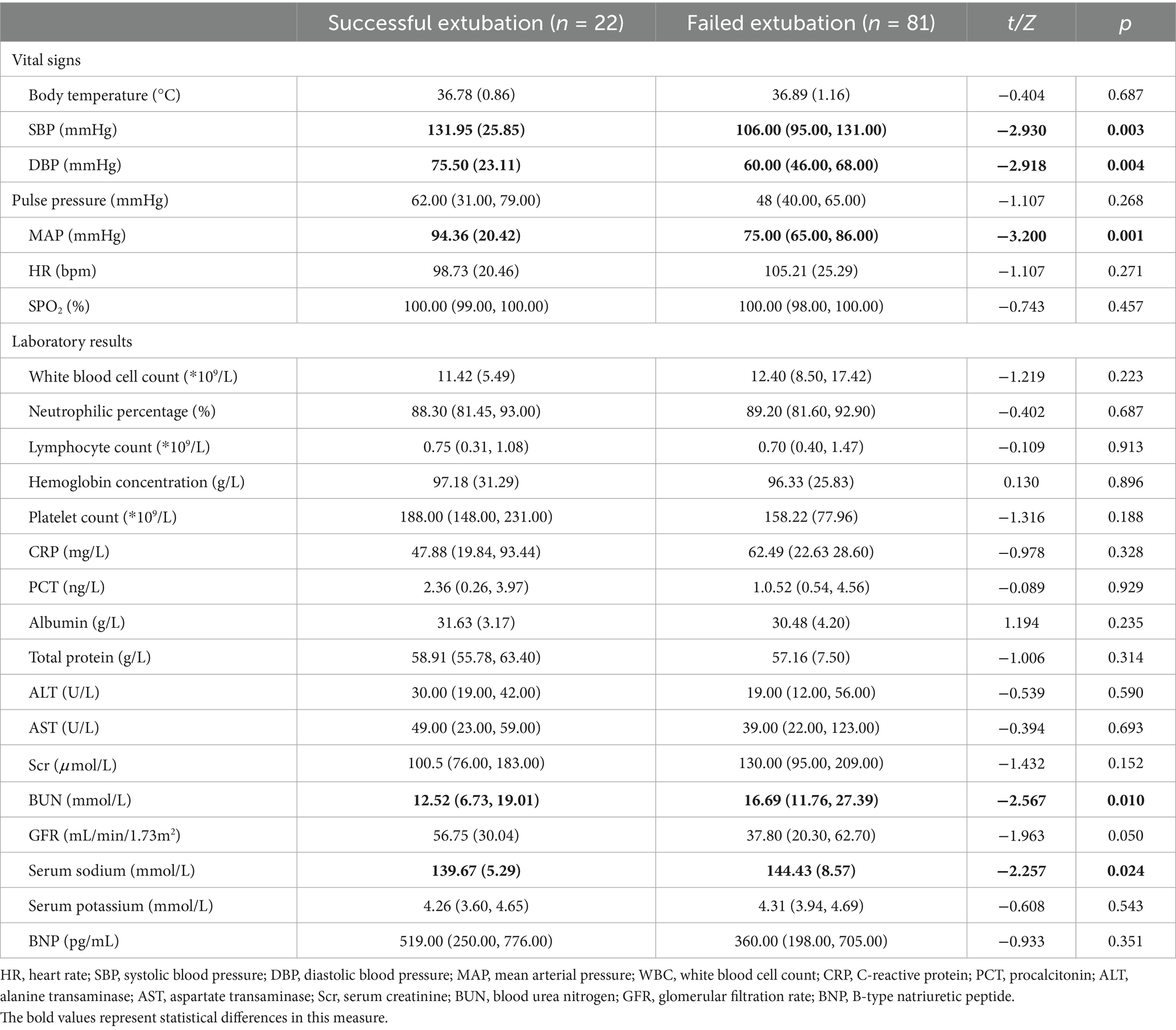 Vital signs: systolic blood pressure (SBP) (106.00 [95.00, 131.00]mmHg vs. 131.95 ± 25.85 mmHg, Z = −2.930, p = 0.003), diastolic blood pressure (DBP) (60.00 [46.00, 68.00]mmHg vs. 75.50 ± 23.11 mmHg, Z = −2.918, p = 0.004), and mean arterial pressure (MAP) (75.00 [65.00, 86.00]mmHg vs. 94.36 ± 20.42 mmHg, Z = −3.200, p = 0.001) in the failed extubation group were significantly lower than in the successful extubation group (all p < 0.01), while temperature, pulse pressure, heart rate, and oxygen saturation showed no differences (all p > 0.05) (Table 2).
