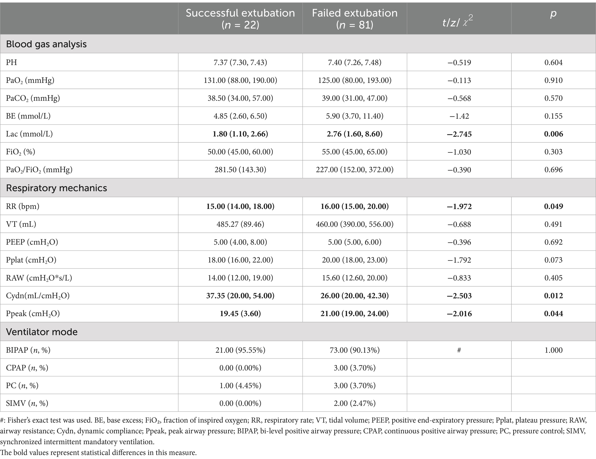 Blood gas indices: Lactate levels in the failed extubation group were significantly higher (2.76 [1.60, 8.60] vs. 1.80 [1.10, 2.66] mmol/L, Z = −2.745, p = 0.006), with no differences in pH, PaO₂, PaCO₂, or PaO₂/FiO₂ (all p > 0.05) (Table 3).