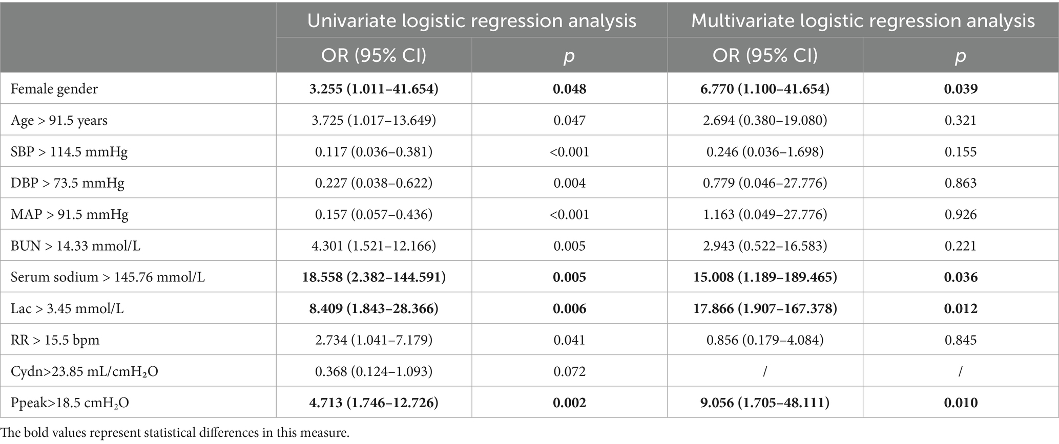 Univariate Logistic regression showed that, except Cydn > 23.85 mL/cmH2O (p = 0.072), female, age > 91.5 years old, SBP > 114.5 mmHg, DBP > 73.5 mmHg, MAP > 91.5 mmHg, BUN > 14.33 mmol/L, Serum sodium > 145.76 mmol/L, Lac > 3.45 mmol/L, RR > 15.5 bpm and Ppeak > 18.5cmH2O were related to extubation failure (all p < 0.05).