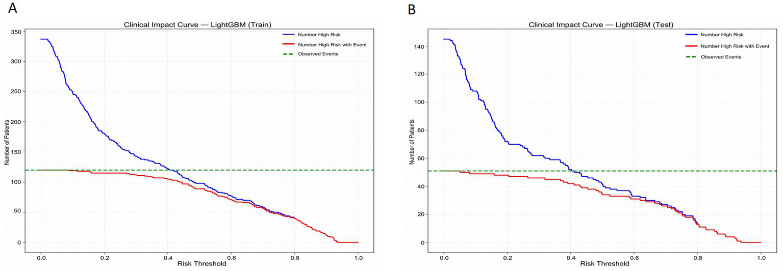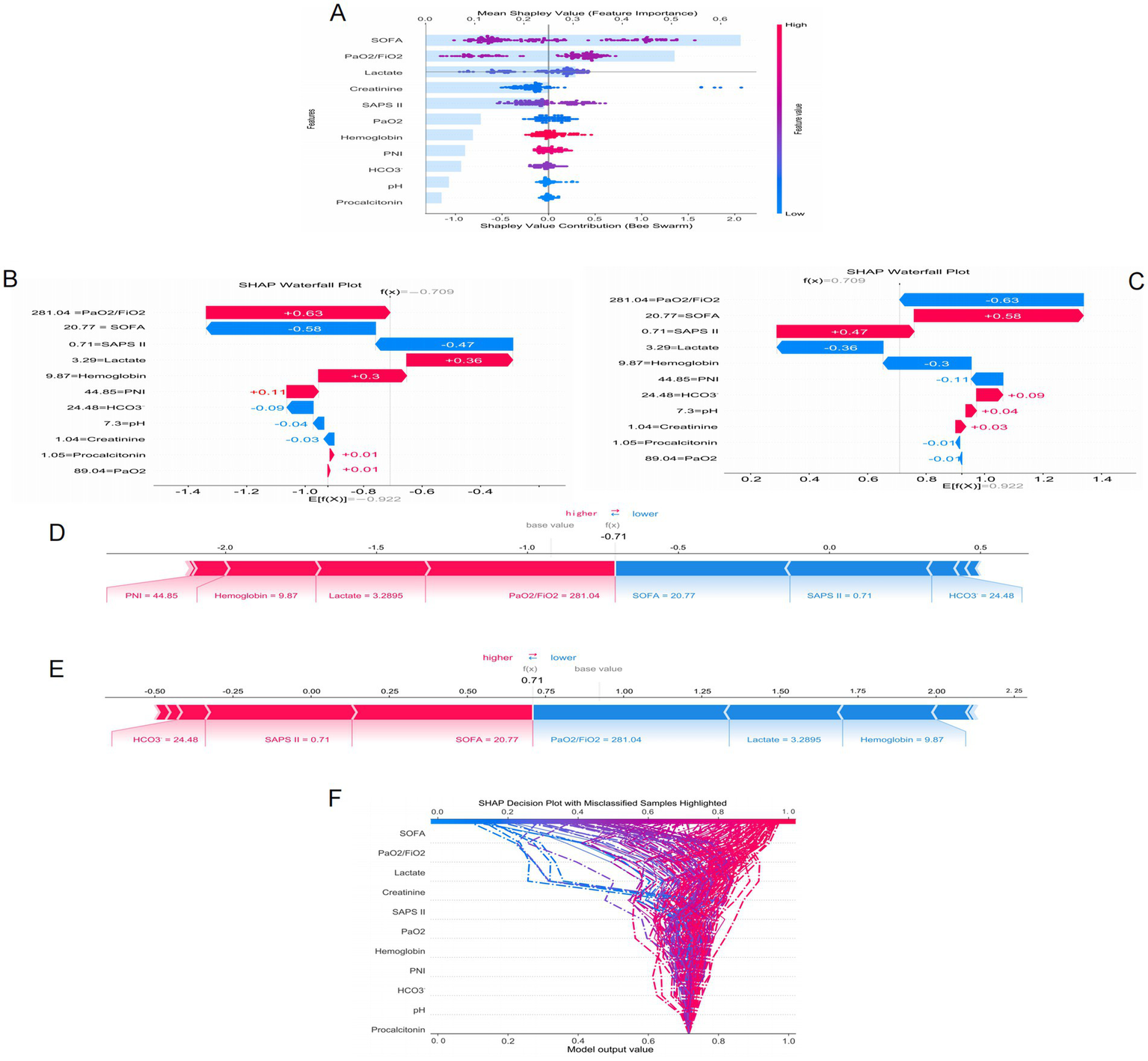 Through the RFE method, the final selected 11 variables. In the training set and test set, the AUC of the LightGBM model was 0.954 (95% CI: 0.933–0.973) and 0.923 (95% CI: 0.864–0.967) respectively. In this study, the calibration curve of the LightGBM model was close to the diagonal, indicating that its probability predictions were relatively reliable. In the DCA curves, the LightGBM model consistently maintained the highest net gain within the threshold range of 0–0.4, indicating LightGBM has greater clinical practical value. Through SHAP analysis, it was found that the SOFA score, PaO2/FiO2 ratio, lactate level, creatinine, and SAPS II score were the five most important features in the model prediction.