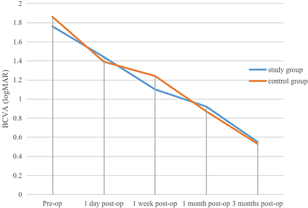 Figure 2. Changes in BCVA at various pre-operative and post-operative time points in the study and control groups.