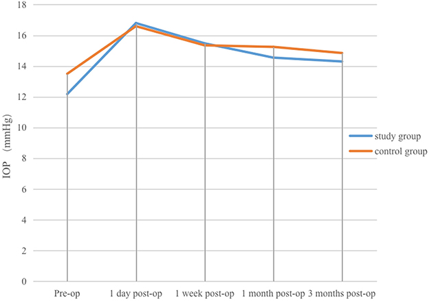 Figure 3. Changes in IOP at various pre-operative and post-operative time points in the study and control groups.