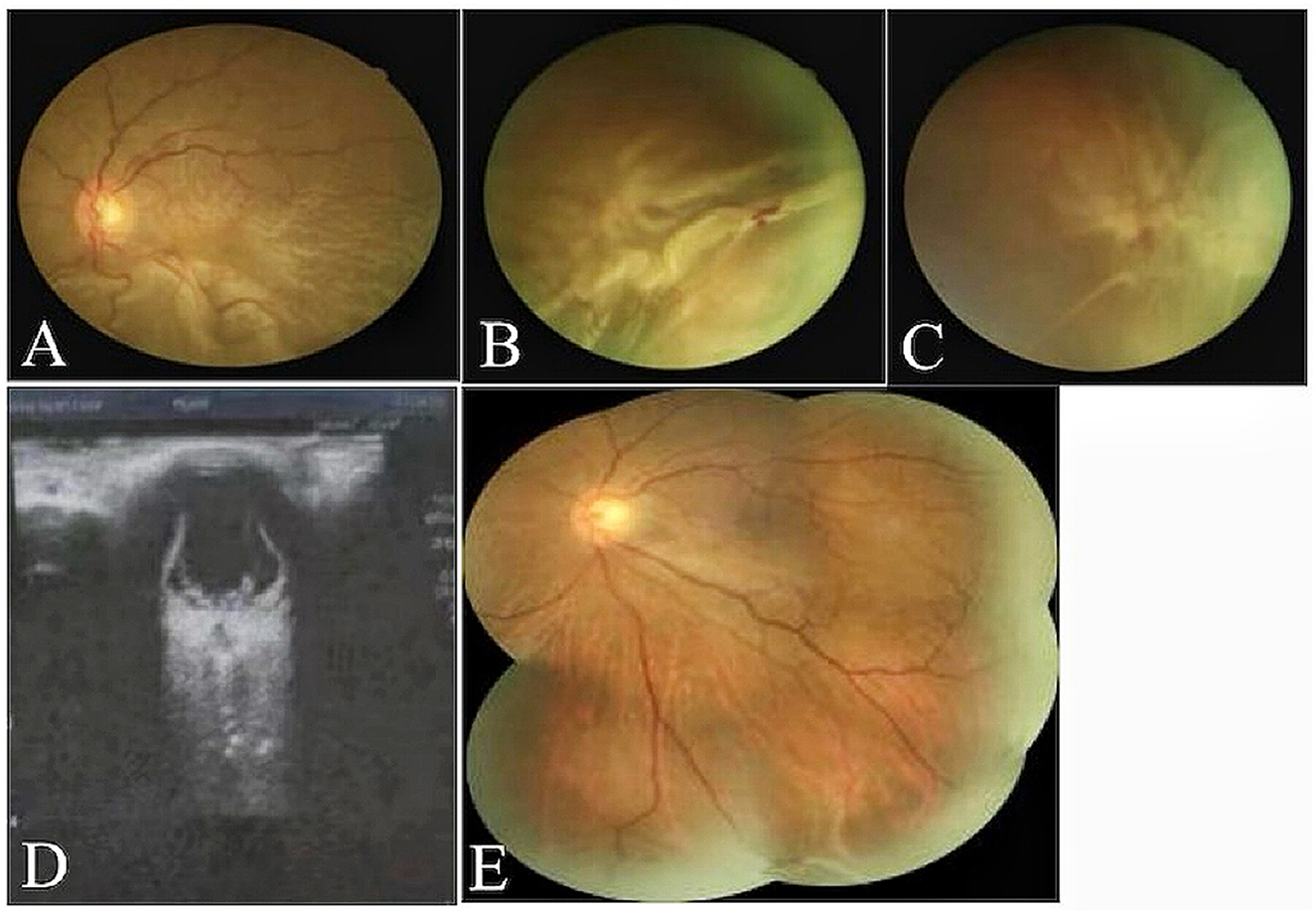Figure 4. (A–D) Fundus photography and ocular ultrasound demonstrated pre-operative total retinal detachment and proliferative retinal changes in the patient. (E) One month post-operative complete retinal reattachment in patients undergoing combined SB and pure C3F8 gas filling.