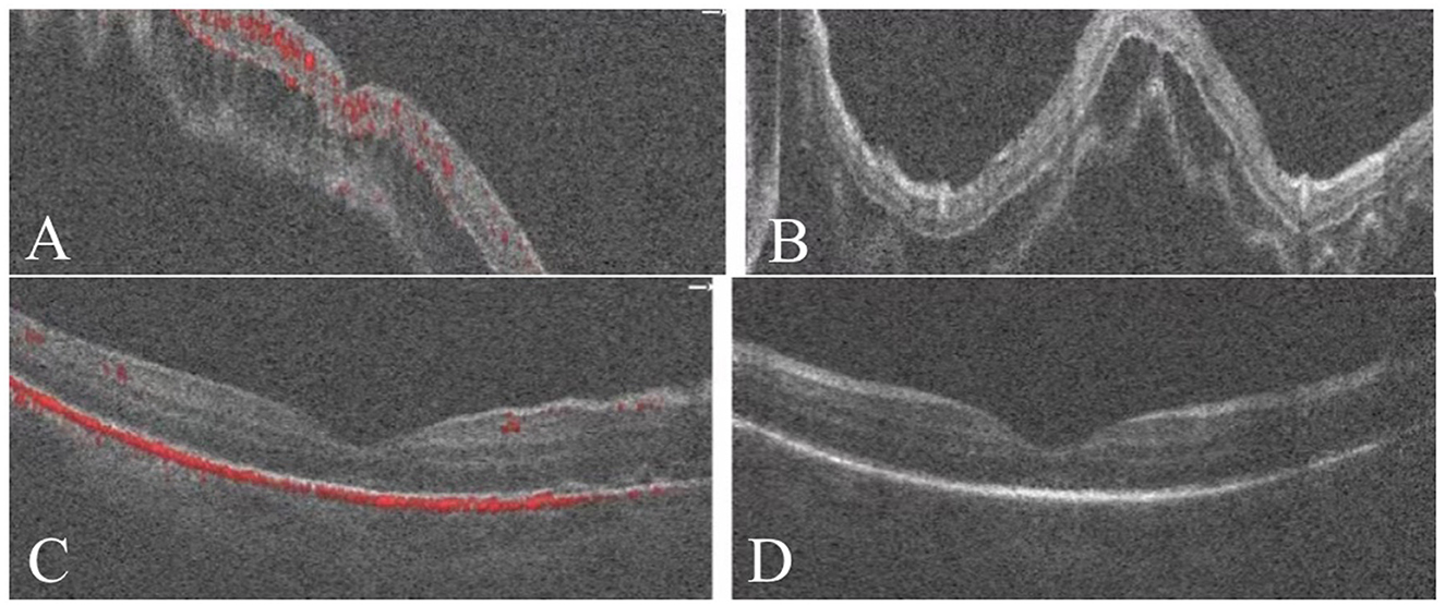 Figure 5. (A, B) OCT revealed pre-operative separation of the retinal neuroepithelium from the pigment epithelium, with a subretinal fluid-filled area. (C, D) One month post-operatively, retinal reattachment was achieved with absorption of the subretinal fluid and no significant fluid accumulation observed.
