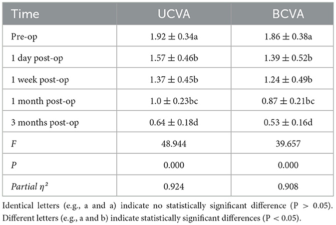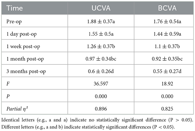 Table 2. Comparison of within-group differences in UCVA and BCVA at different times between pre-operative and postoperative periods in the study group ().