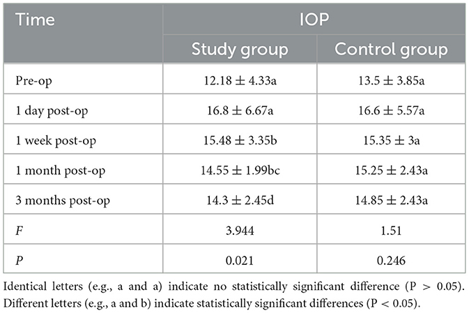 Table 3. Comparison of intragroup differences in IOP at different times between pre-operative and post-operative periods in the study and control groups ().
