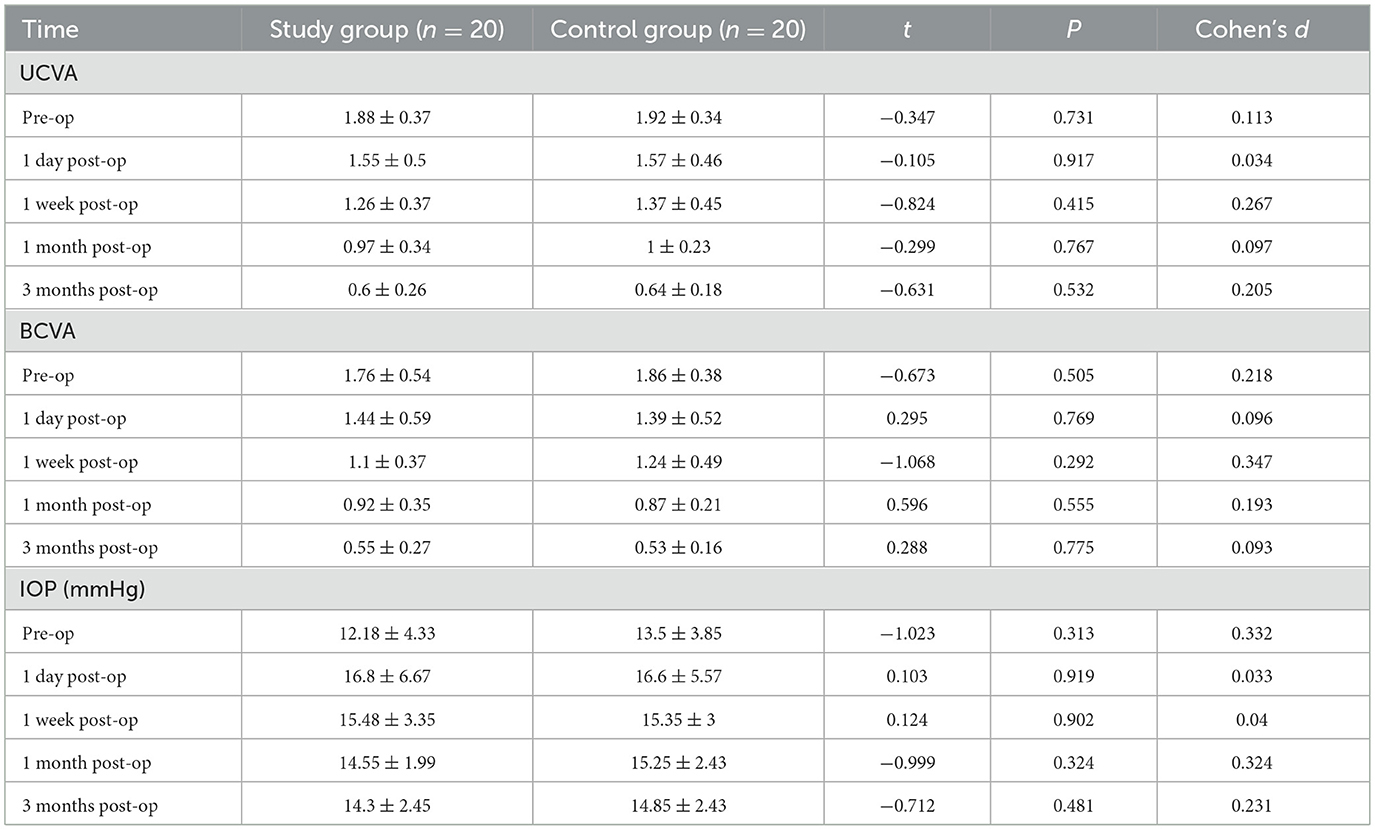Data were analysed using SPSS 27.0. After testing for normality, the mean and standard deviation of continuous variables were calculated. Quantitative variables (UCVA, BCVA, and IOP) were expressed as mean ± standard deviation (x ± s). For repeated measures (UCVA, BCVA, and IOP), repeated-measures analysis of variance (ANOVA) was performed. Independent-samples t-test were used to compare intergroup differences in UCVA, BCVA, and IOP between the study and control groups, while Fisher's exact test was used to compare intergroup differences in retinal reattachment rate. A P < 0.05 was considered statistically significant. Effect sizes are represented by Cohen's d, partial η2, and Odds Ratio (OR). Cohen's d ranges from 0 to 1, with values below 0.5 indicating a small effect, 0.5–0.8 denoting a medium effect, and above 0.8 signifying a large effect. The partial η2 ranges from 0 to 1, with values between 0.01 and 0.06 indicating a small effect, between 0.06 and 0.14 representing a medium effect, and greater than 0.14 signifying a large effect. OR = 1 indicates no association, OR < 1 denotes a negative association, OR > 1 signifies a positive association, and a higher OR value indicates a stronger association.