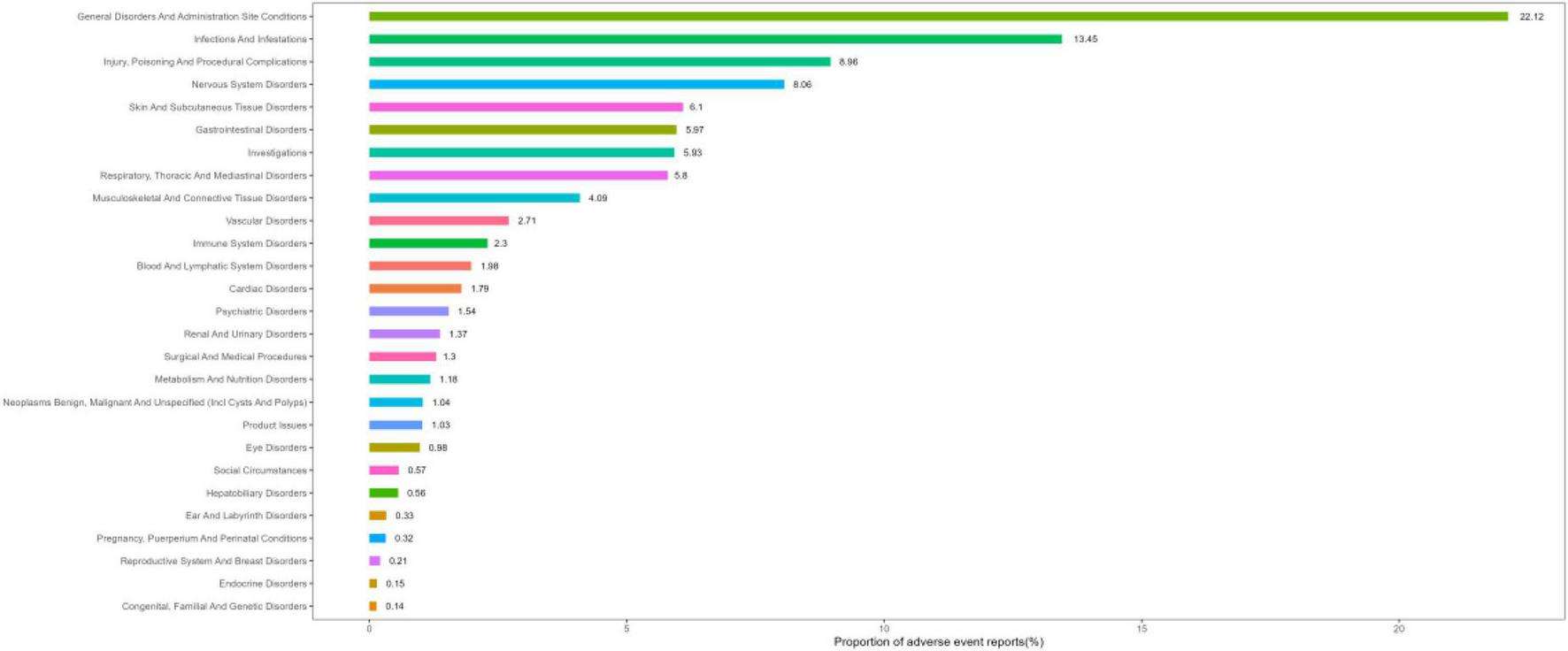 System organ class (SOC) ranking based on percentage of reports.