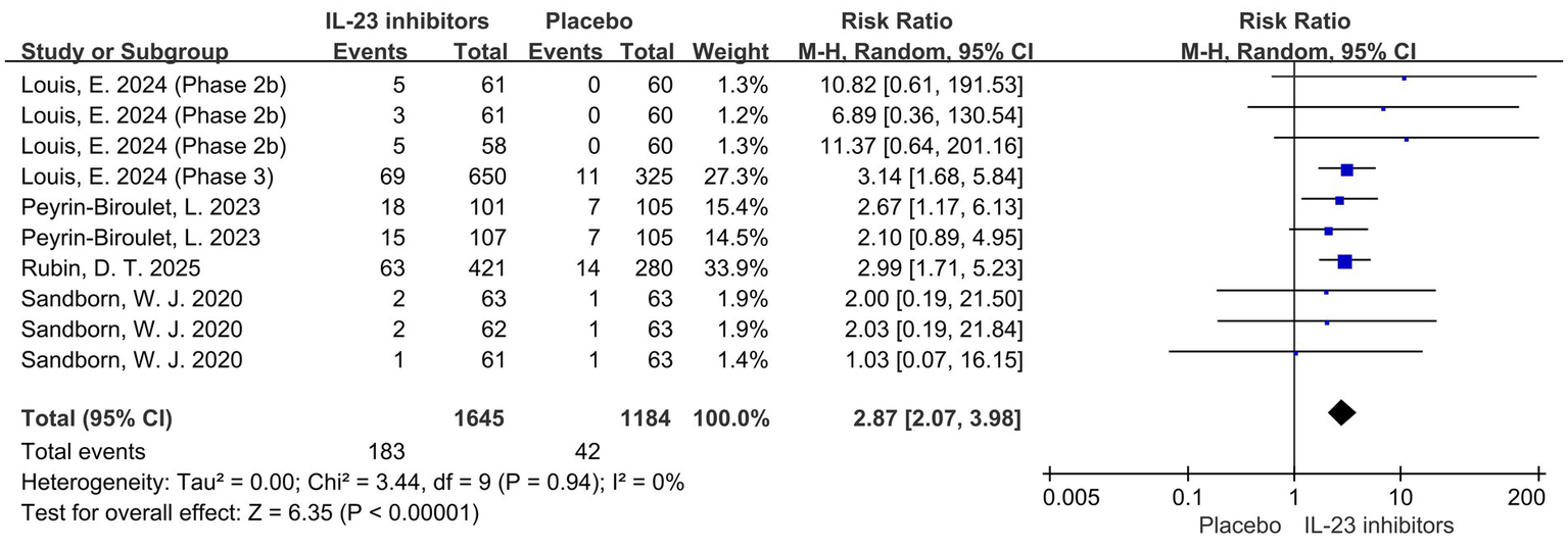 Six RCTs encompassing 3,640 patients were included. IL-23 inhibitors significantly improved clinical remission during induction compared to placebo (RR = 2.45; 95% CI: 2.07–2.90; p < 0.001; I2 = 0%), as well as clinical response (RR = 2.03; 95% CI: 1.74–2.38; p < 0.001). Endoscopic improvement was also significantly higher in the IL-23 group (RR = 2.49; 95% CI: 2.03–3.06; p < 0.001). Subgroup analyses demonstrated consistent efficacy in biologic-naïve and treatment-refractory populations. The incidence of any adverse events was comparable between IL-23 inhibitors and placebo (RR = 0.91; 95% CI: 0.85–0.98; p = 0.01), with no increase in serious infections.