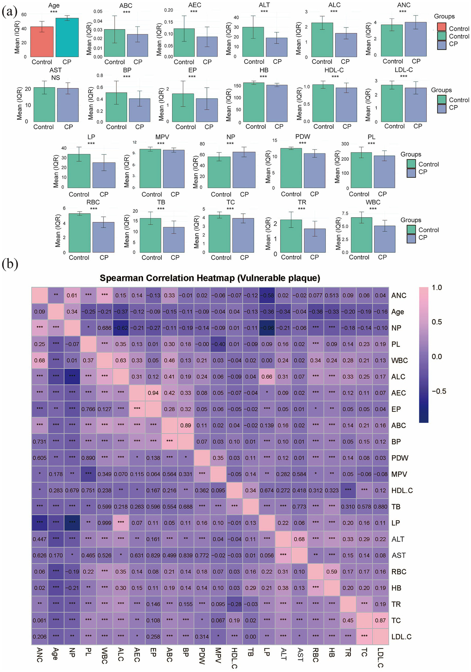 Profiles of 22 demographic and hematological characteristics. (a) Bar graph showing the differences for all indices, with significance denoted as *** for p < 0.001 and ‘NS’ for non-significant. (b) Inter-variable associations are depicted by a Spearman correlation heatmap.