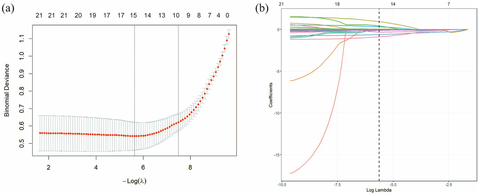 The LASSO regression method imposes a penalty function to shrink the coefficients of variables toward zero. This process enhances model generalizability by reducing overfitting and alleviating the effects of multicollinearity (27). As a result, LASSO regression improves predictive performance and model interpretability through the selection of the most pertinent risk factors, leading to an efficient and robust predictive model (28). We utilize the glmnet package in R for LASSO regression. A total of 21 hematological parameters from all patients were included in the LASSO regression analysis. The LASSO regression analysis employed a binomial model due to the binary nature of the grouping variable. All predictor variables were standardized before being entered into a binomial LASSO model. The tuning parameter (λ) was selected through 10-fold cross-validation implemented via the cv.glmnet function. In brief, the dataset was randomly divided into ten equal parts. For each λ value generated across a logarithmic sequence, the model was trained on nine folds and evaluated on the remaining fold. This process was repeated across all folds, and the average cross-validated deviance was calculated for every candidate λ. The optimal penalty parameter (λ) was determined using 10-fold cross-validation. For each candidate λ value, the cross-validated mean squared error (MSE) was calculated, and the λ that minimized the MSE (λ_min) was selected. We also recorded the λ falling within one standard error of the minimum (λ_1se) and displayed both values in the cross-validation plot. Using the selected optimal λ, the LASSO model was finally refitted: