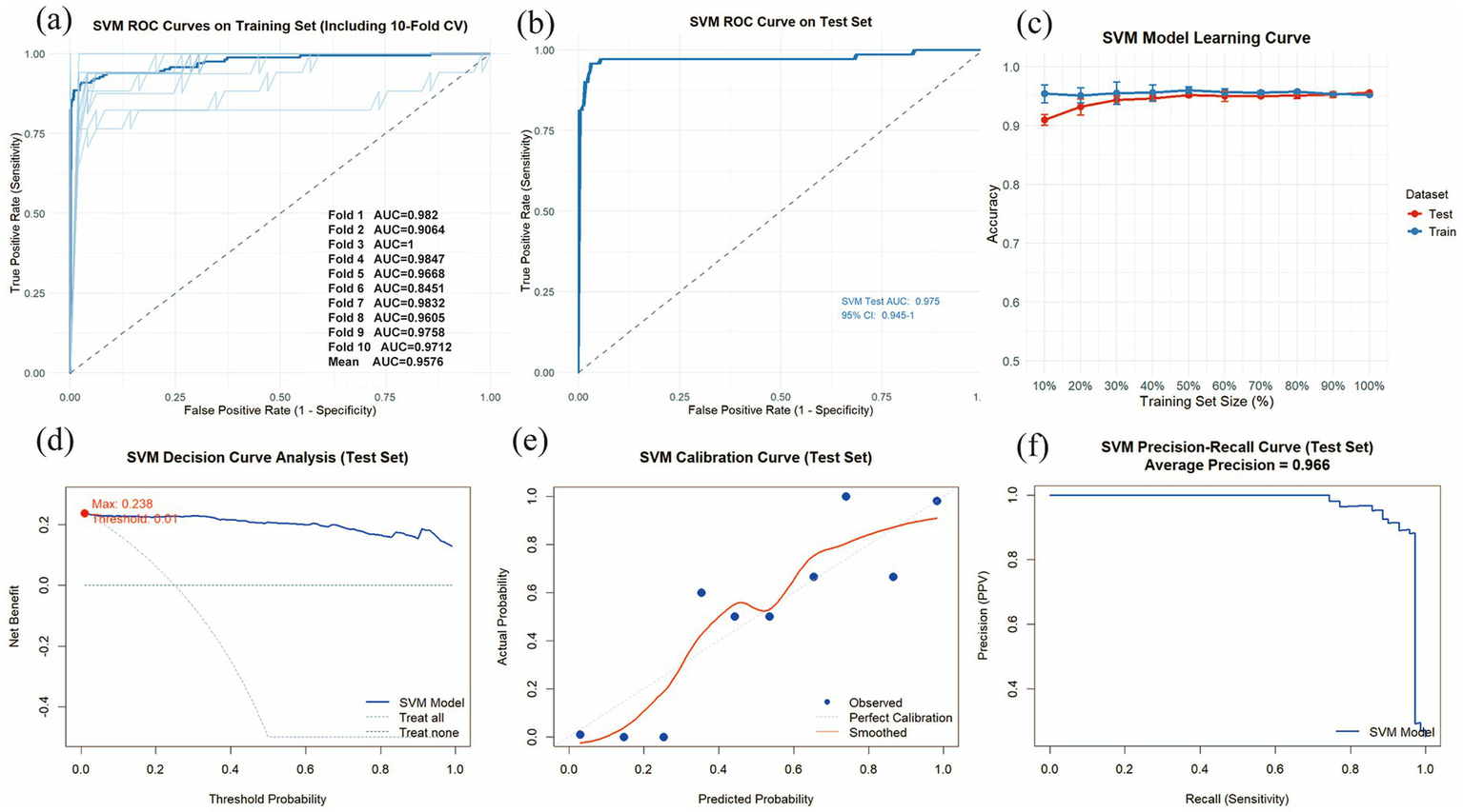 A 10-fold cross-validation was performed on the training set. Subsequently, ROC curves were generated for the training set and test set based on the 10 cross-validated iterations. The learning curve is a graphical tool used to evaluate the training dynamics and generalization capability of a model. It illustrates the trajectory of model performance as a function of the training dataset size or the number of iterations, thereby aiding in the diagnosis of issues such as underfitting, overfitting, or insufficient training data (34). All the aforementioned steps were visualized using R (e1071: v1.7, caret: v6.0).