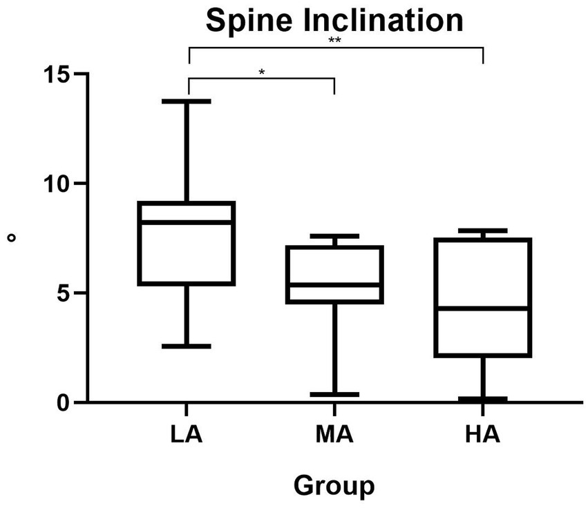 No significant differences in spine parameters in the frontal plane among the 3 groups were found. In the sagittal plane, we found a significant difference on the spine sagittal imbalance parameter (F(2, 40) = 6.17; p = 0.005), with the highest spine sagittal imbalance in the LA group. Furthermore, in the sagittal plane, we detected a significant difference in the spine inclination parameter (F(2, 40) = 5.93; p = 0.006), with the highest spine inclination in the LA group.
