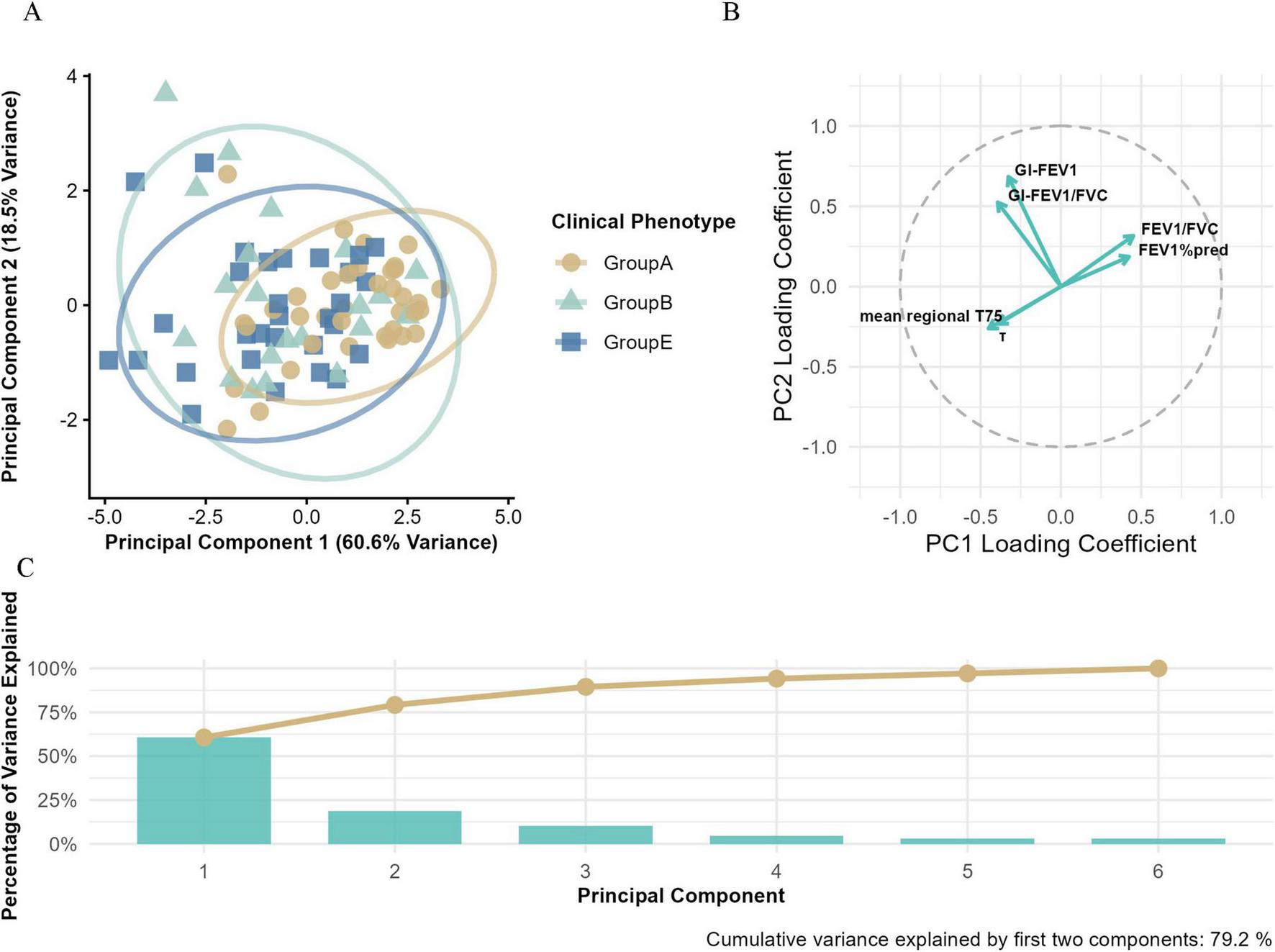 Principal component analysis (PCA) of Groups A, B, and E. (A) The PCA based on electrical impedance tomography (EIT) parameters and conventional pulmonary function metrics, illustrating the multidimensional separation of clinical phenotypes. (B) The loading plot that visualizes the contribution of variables to principal components (PCs), with the horizontal axis representing PC1 loading coefficients and the vertical axis representing PC2 loading coefficients. (C) The variance explained by principal components, where blue bars indicate the variance explained by individual PCs and the orange line shows the cumulative variance explained.
