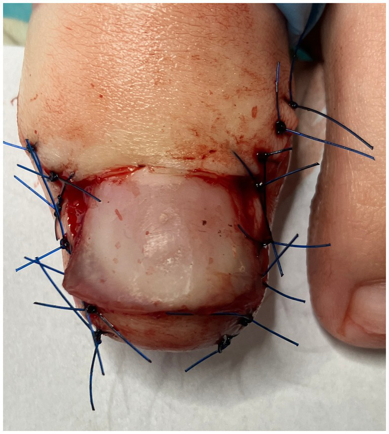 In this study, each surgical correction of the nail folds was preceded by conservative reconstruction of the nail plate, performed using Arkada’s method. This podiatric, non-surgical treatment aims to restore the nail plate, which is often deformed or incomplete due to accompanying inflammation or previous (most often surgical) interventions. The procedure is carried out with a specialized device called Arkada’s cube, which enables non-invasive repositioning of the hypertrophic nail folds, thereby exposing the nail plate and allowing its defects to be corrected with materials such as acrylic or composite (10, 12, 29). Repairing the nail plate and covering its surface with these materials helps restore its physiological shape and hardness (12, 29). As a result, the reconstructed nail plate—elevated and reinforced with acrylic or composite material—can grow properly, while the surrounding folds are no longer irritated by the previously damaged plate. Conservative nail reconstruction is typically performed immediately before the next stage of treatment - plastic surgery of the nail folds. The procedure is carried out under local anesthesia, and sutures are removed approximately 2 weeks later. Recommended postoperative care includes natural, physiological walking and gentle pressure on the operated toe to promote proper healing. The procedure used in the study is presented in Figures 1–5.