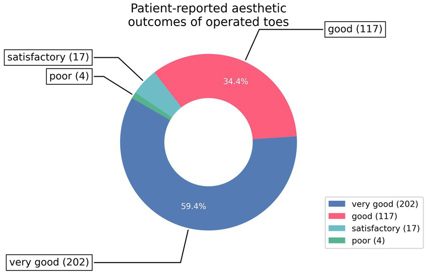 Similarly, almost 95% of patients described the final aesthetic appearance of their toes as good (34.4%) or very good (59.4%). Lower ratings were reported by a minority of patients, with 5% (n = 17) assessing the results as fair and 1.2% (n = 4) as poor.