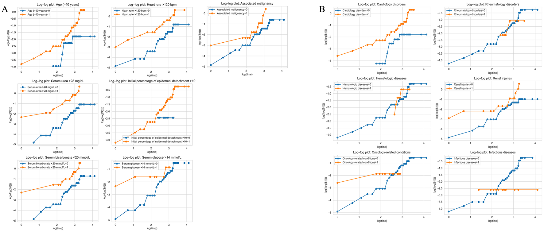 Figure 4. Evaluation of proportional hazards assumptions using visual inspection of log–log survival plots. (A) Visual inspection of log–log survival plots for each covariate in the only SCORTEN and the SCORTEN model; (B) Visual inspection of log–log survival plots for each covariate in the comorbidities model with SCORTEN factors.