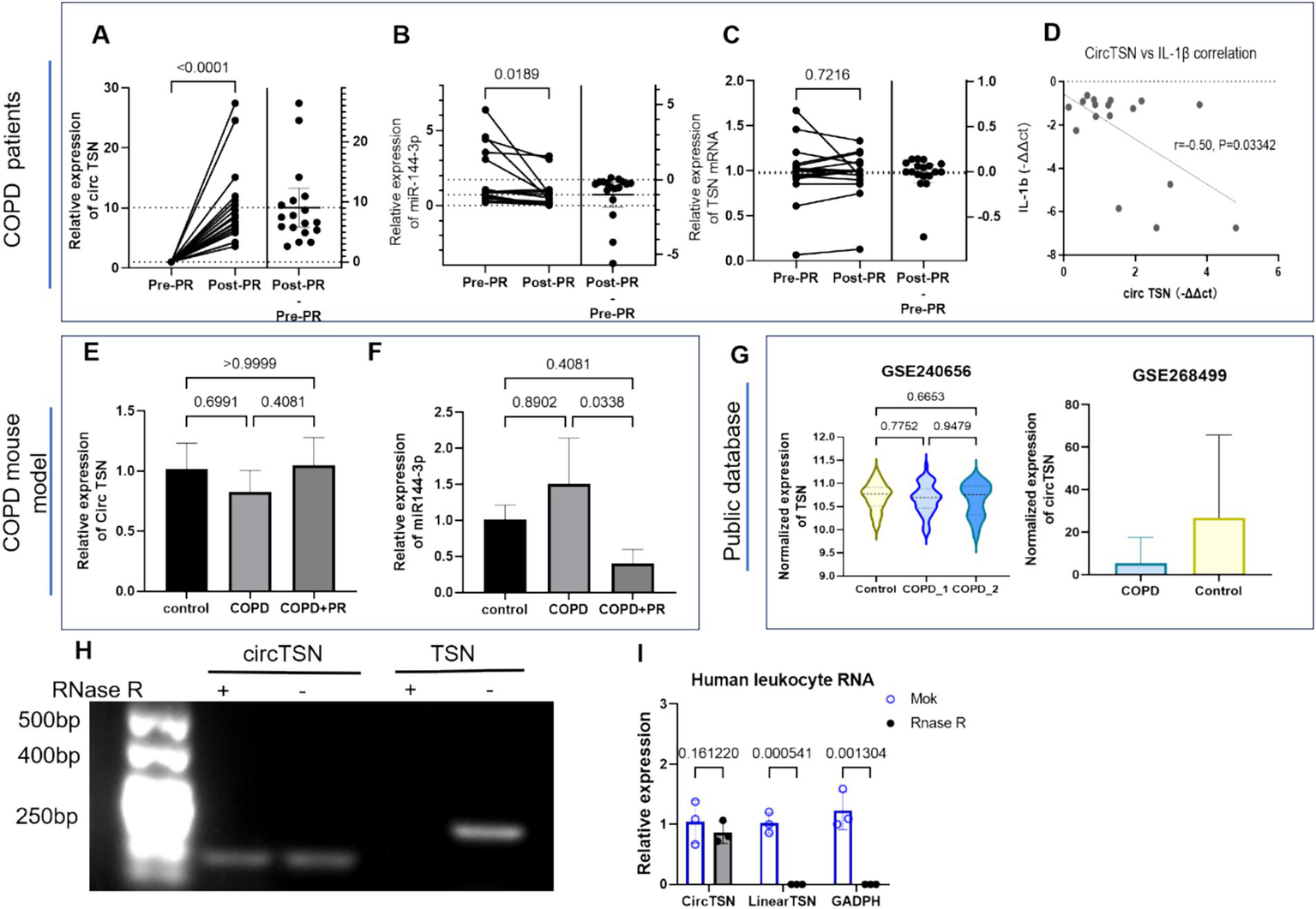 Relative expression of circ TSN and miR-144-3p in peripheral leukocytes from COPD patients and lung tissues of COPD mice. (A–C) circTSN, miR-144-3p, and linear TSN relative expression in peripheral leukocytes from COPD patients before (Pre-PR) and after pulmonary rehabilitation (Post-PR). Data were analyzed using ΔCt values. For clarity, fold change (2−ΔΔCt) is shown in the figures. (D) The scatter plot shows post–pre changes in circTSN versus cytokine IL-1β (r = −0.50, p = 0.033). (E,F) circTSN and miR-144-3p expression in lung tissue from the elastase-induced COPD mouse model, including control, COPD, and COPD + PR (COPD mice with pulmonary rehabilitation) groups. Data are presented as mean ± SD (n = 3 per group). (H,I) RNase R digestion confirming circularity of circTSN in BEAS-2B cells. (G) External validation (GSE240656, GSE268499) reveals a reduced trend of circTSN in COPD, with no significant change in TSN mRNA.