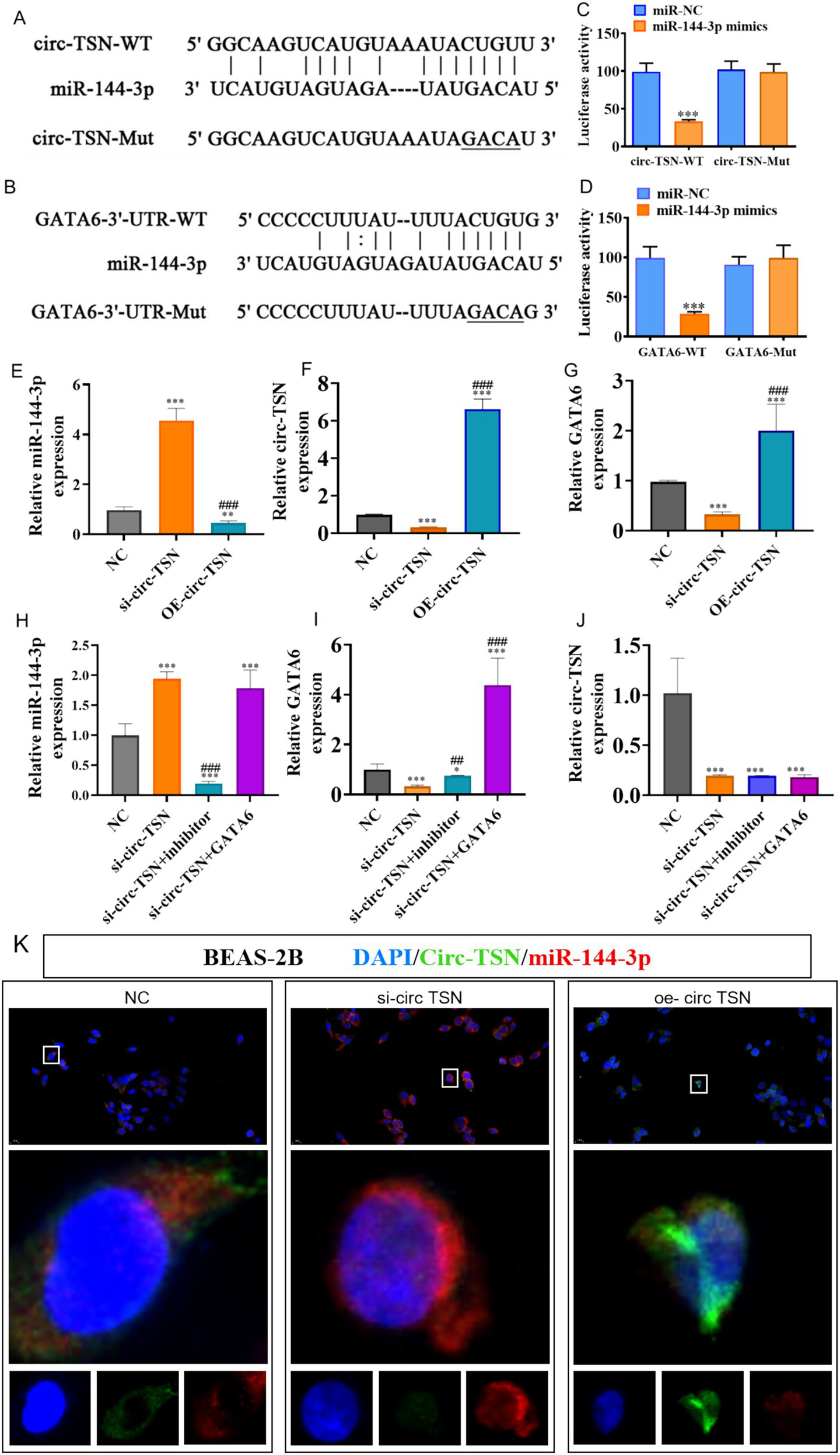 circTSN functions as a molecular sponge for miR-144-3p to regulate GATA6 expression in BEAS-2B cells. (A,B) Dual-luciferase reporter assays confirming direct binding of miR-144-3p to circTSN (A) and the GATA6 3′-UTR (B). Mutation of the predicted binding sites abolished the inhibitory effect of miR-144-3p on luciferase activity. (C–J) Expression analysis of circTSN, miR-144-3p, and GATA6 in BEAS-2B cells following circTSN overexpression (OE), knockdown (si-circTSN), or miR-144-3p inhibitor. (K) Fluorescence in situ hybridization (FISH) images showing subcellular co-localization of circTSN (green) and miR-144-3p (red) in BEAS-2B cells under NC, OE, and si-circTSN conditions. Nuclei are stained with DAPI (blue). Co-localization in the cytoplasm supports their interaction.