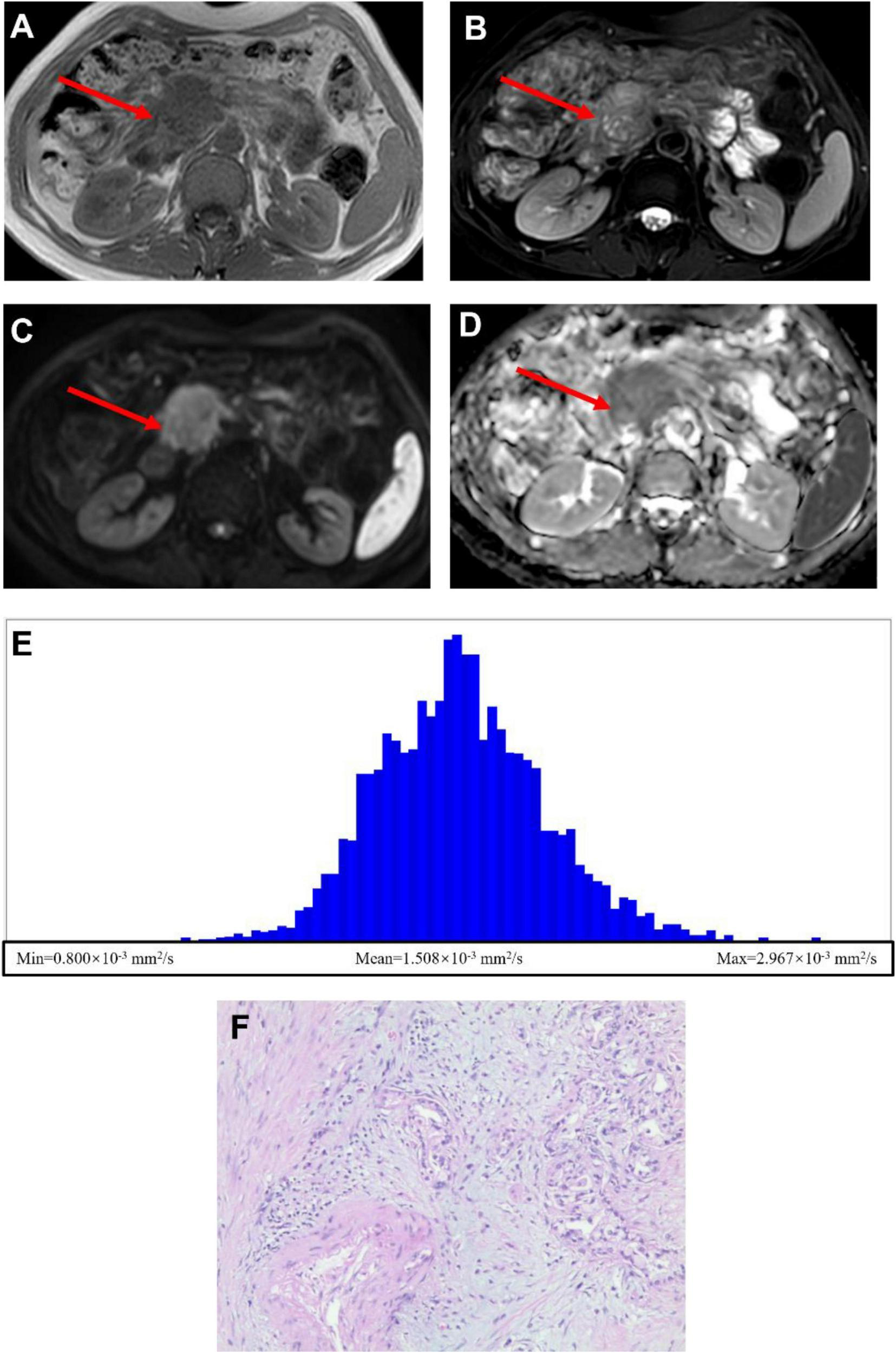 A 72-year-old female patient with pancreatic ductal adenocarcinoma and lymph node metastasis (LNM). (A) Axial T1-weighted image showing a mass-like lesion with isointense signal intensity in the pancreatic head. (B) Axial T2-weighted image demonstrating heterogeneous signal intensity within the lesion, predominantly mildly hyperintense. (C) Diffusion-weighted image (b = 800 s/mm2) showing hyperintensity in the lesion. (D) Calculated ADC map in which the lesion appears to have a higher diffusion rate. (E) Whole-tumor ADC histogram analysis showing the following quantitative parameters: ADC-min = 0.800 × 10–3 mm2/s, ADC-mean = 1.508 × 10–3 mm2/s, and ADC-max = 2.967 × 10–3 mm2/s. (F) Histopathological section confirming pancreatic ductal adenocarcinoma with LNM (H&E × 100).