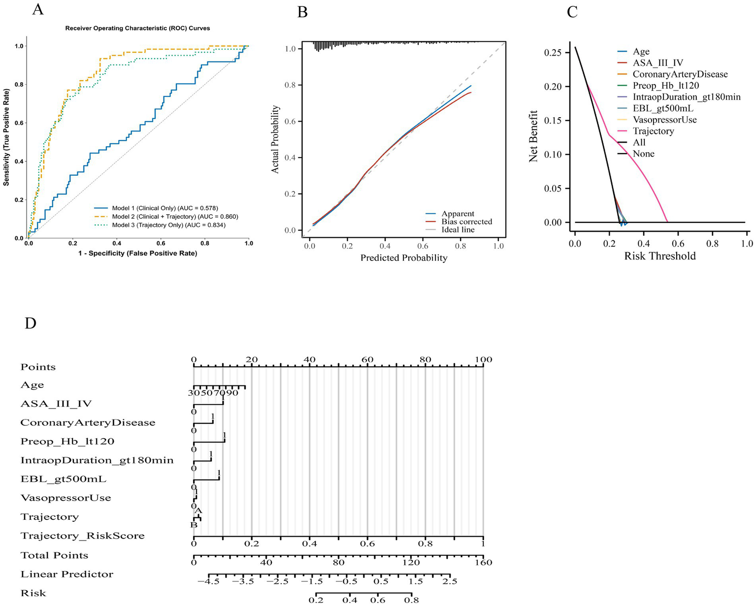 Multivariable logistic regression analysis identified intraoperative hypotension trajectory as an independent predictor of the primary composite complication (Table 3). Compared with Trajectory A, patients in Trajectory B had a 58% higher adjusted odds of developing the primary composite complication (adjusted OR 1.58, 95% CI 1.03–2.43, p = 0.035), while those in Trajectory C had more than double the risk (adjusted OR 2.42, 95% CI 1.54–3.80, p < 0.001), with a significant dose–response relationship (p for trend < 0.001). Other independent predictors included older age (per 10-year increase: adjusted OR 1.19, 95% CI 1.04–1.37, p = 0.012), ASA classification III–IV (adjusted OR 1.61, 95% CI 1.14–2.29, p = 0.007), coronary artery disease (adjusted OR 1.77, 95% CI 1.10–2.85, p = 0.019), preoperative hemoglobin <120 g/L (adjusted OR 1.49, 95% CI 1.06–2.09, p = 0.022), intraoperative duration >180 min (adjusted OR 1.42, 95% CI 1.02–1.98, p = 0.039), and estimated blood loss >500 mL (adjusted OR 1.72, 95% CI 1.17–2.53, p = 0.006). Vasopressor use showed a non-significant association (p = 0.112). These findings indicate that more severe or prolonged intraoperative hypotension trajectories remain strong, independent risk factors for major postoperative complications, even after adjusting for patient comorbidities and intraoperative variables.