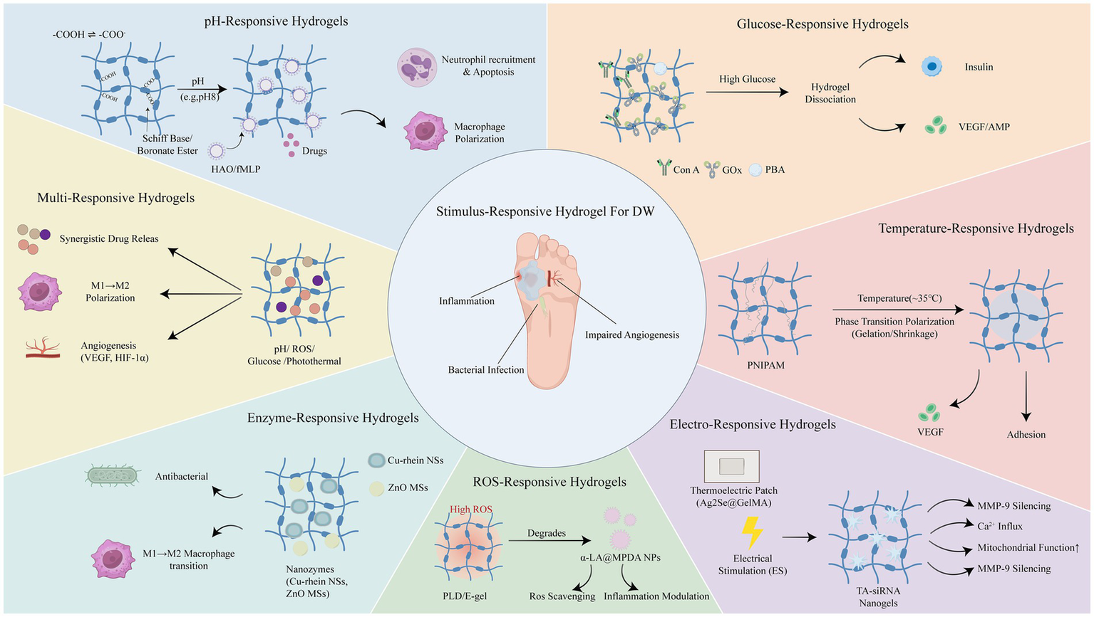 Summary of representative stimuli-responsive hydrogel systems for diabetic wound healing.