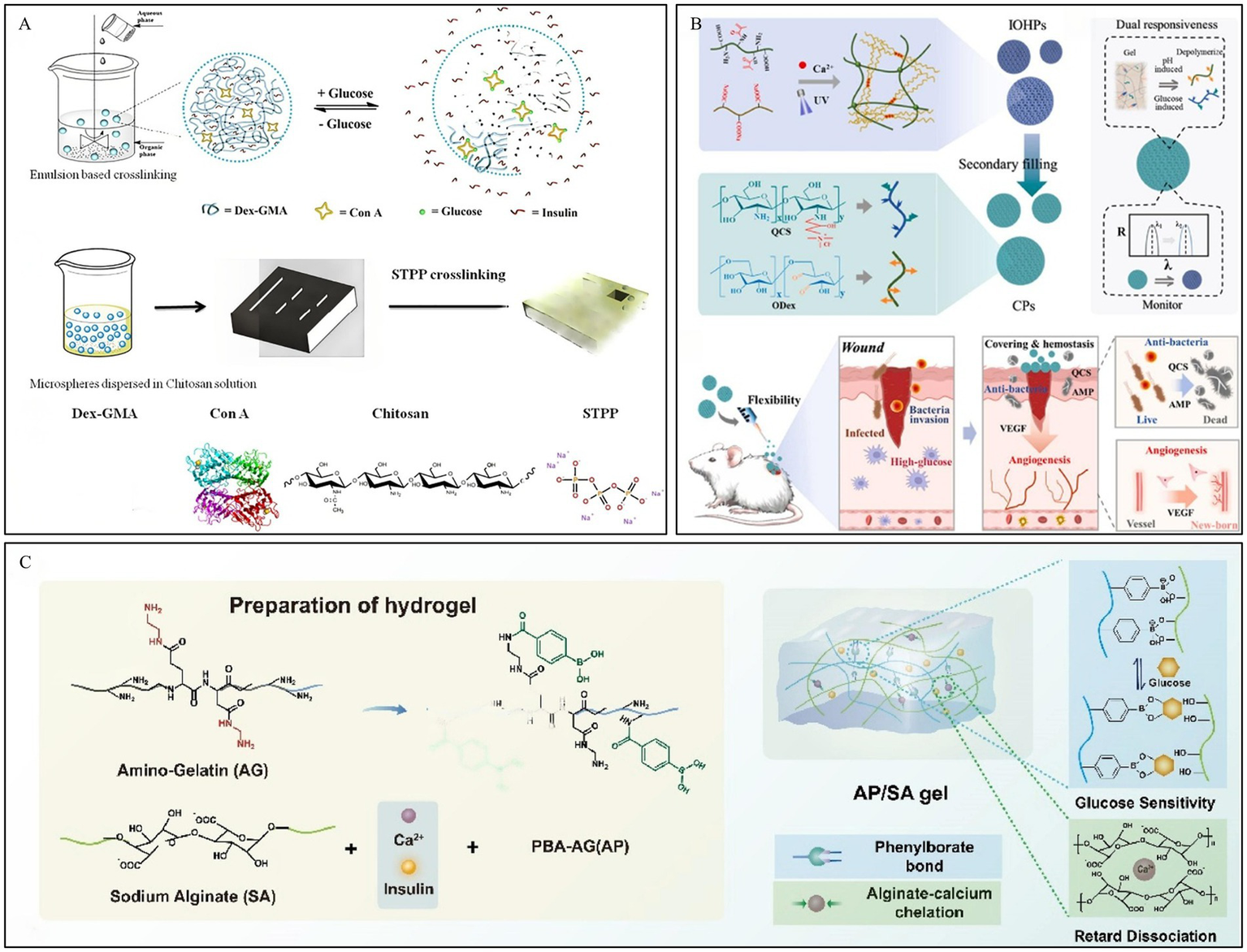 Construction process and structure of representative glucose-responsive hydrogels. (A) Fabrication process and glucose-responsive structural change of microspheres. Reproduced from ref. (73) Copyright 2019 Elsevier. (B) Schematic of CPs preparation and their application in DWs. Reproduced from ref. (75) Copyright 2025 Elsevier. (C) Fabrication process of AP/SA gel. Reproduced from ref. (77) Copyright 2026 Elsevier.
