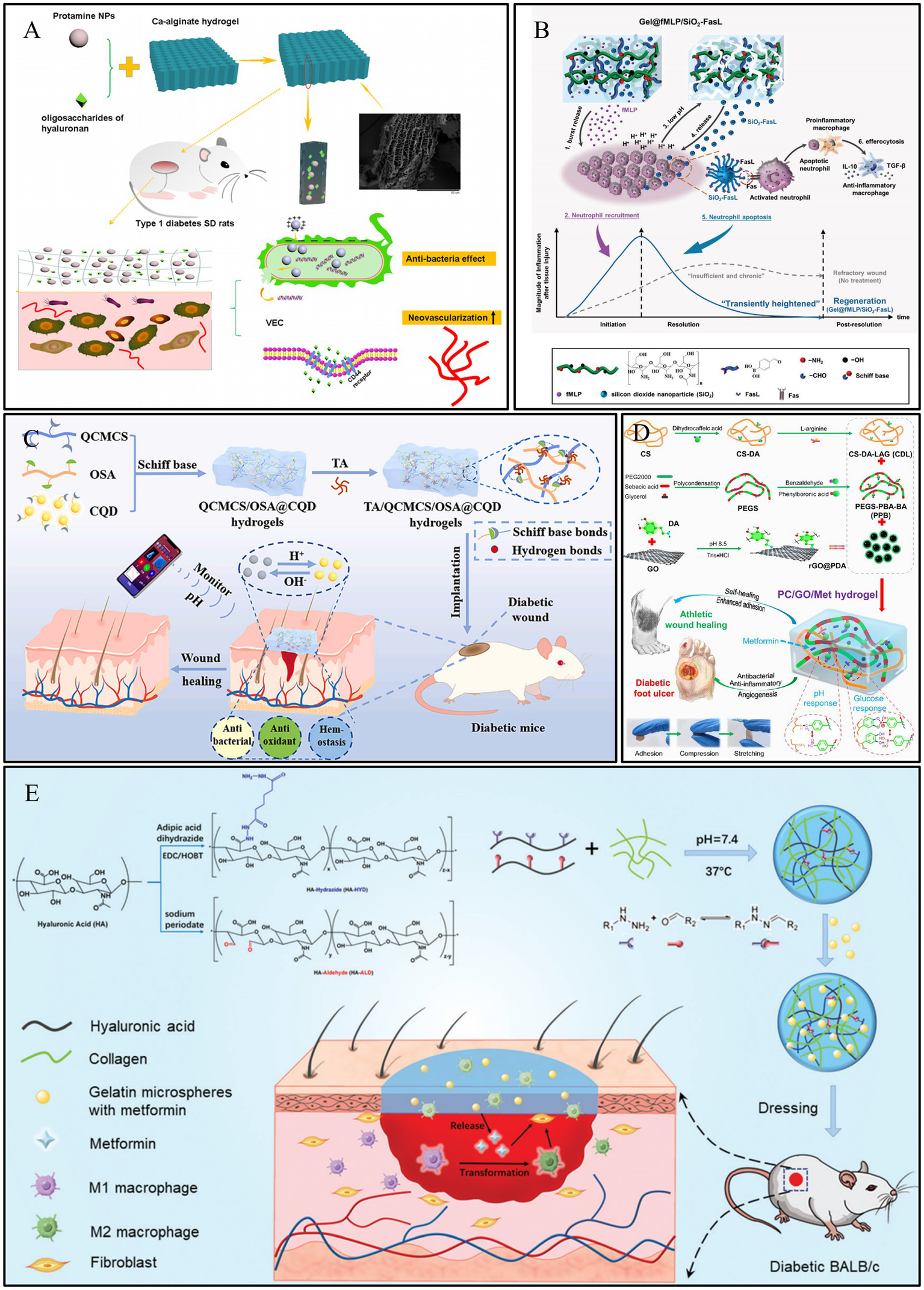 Diabetes mellitus (DM) is a chronic disease characterized by elevated blood glucose levels, leading to metabolic disorders with significant consequences (1, 2). The number of adults with diabetes worldwide has exceeded 800 million, having increased more than fourfold since 1990 and is expected to increase to 1.31 billion by 2050 (3, 4). Among the various complications associated with DM, diabetic foot ulcers (DFUs) represent a major clinical challenge due to their complexity and poor healing (5). DFU is one of the serious complications leading to disability and death in diabetic patients, which is highly prevalent, difficult and costly to treat, resulting in a serious health and economic burden worldwide (6). Alarmingly, approximately 25% of DFU require amputation within 6 to 18 months of diagnosis, which is 10 to 20 times higher than in nondiabetic individuals (7–10). The healing process of DWs is often impeded, or even completely stalled, due to factors such as excessive inflammation, oxidative stress, peripheral neuropathy, and impaired angiogenesis in the local wound environment (11, 12). In the clinical management of these wounds, dressings play a pivotal role. However, traditional dressings often possess singular biochemical functions and are incapable of precise active substance delivery, which limits their efficacy in the treatment of DWs. In contrast, stimuli-responsive multifunctional hydrogel dressings, which can achieve controlled release of active substances in response to changes in the wound microenvironment, hold significant potential for the therapeutic management of these wounds (13).