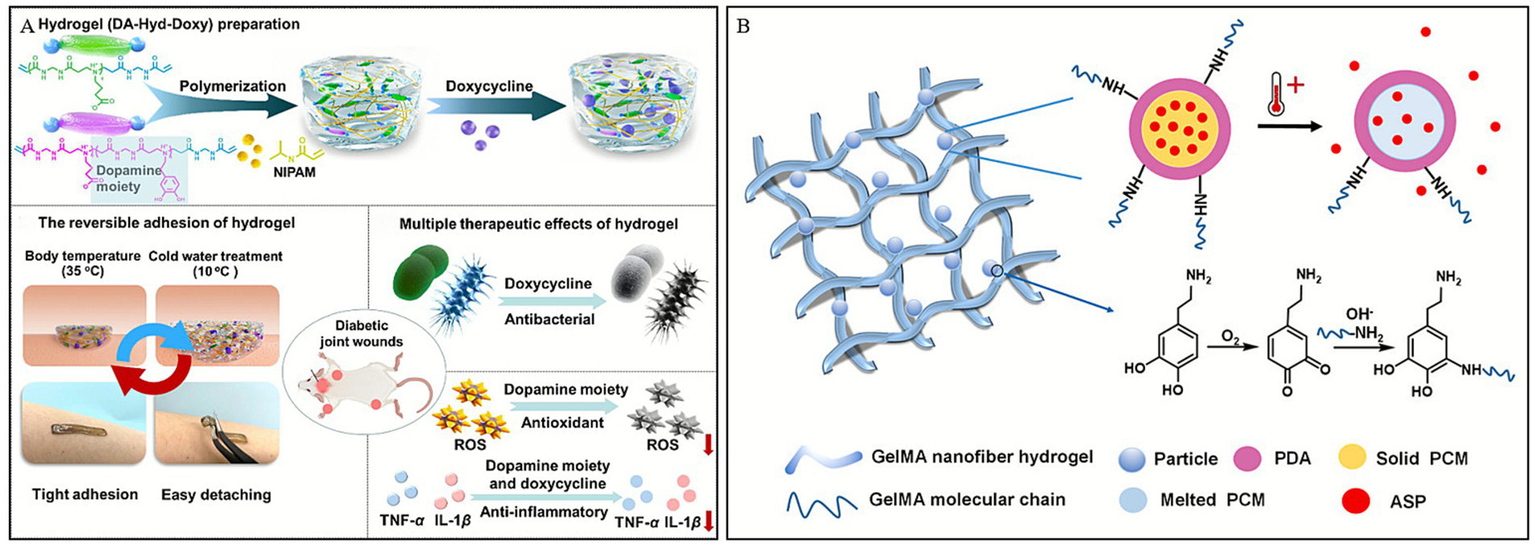 Construction process and structure of representative temperature-responsive hydrogels. (A) Illustration of the preparation of a hydrogel dressing (DA-Hyd-Doxy) and its mechanism for the treatment of DWs. Reproduced from ref. (93) Copyright 2025 ACS. (B) Schematic displays the temperature-triggered release of ASP from PDA nanoparticles. Reproduced from ref. (96) Copyright 2021 Elsevier.