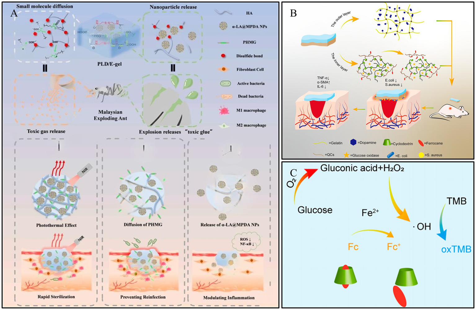ROS are a class of highly reactive ions produced in the human body. They play a crucial role in regulating cellular signaling pathways, inflammation, and cell proliferation (90). However, in the chronic DWs environment, the redox balance is disrupted, leading to oxidative stress, which inhibits wound healing (100). ROS-responsive hydrogels are designed to cleave and accelerate drug release when ROS levels are elevated, thereby promoting wound healing. Sun et al. (101) developed an ROS-responsive “explosive hydrogel” (PLD/E-gel) with a size-dependent sequential release effect, based on the water-soluble small molecule polyhexamethylene guanidine (PHMG, P) and mesoporous polydopamine nanoparticles loaded with alpha-lipoic acid (α-LA@MPDA NPs, LD). During the water absorption and swelling of the PLD/E-gel, PHMG effectively prevents wound reinfection through water-soluble diffusion. Subsequently, as the PLD/E-gel degrades, the sub-micron-sized α-LA@MPDA NPs are released from the crosslinked network, scavenging excessive ROS and modulating the inflammatory cascade. The PLD/E-gel accelerates the healing of infected DWs in SD rats by rapidly killing bacteria, inhibiting bacterial recolonization, alleviating wound inflammation, and promoting collagen deposition (Figure 7A). Tan et al. (102) developed a novel bilayer hydrogel designed to regulate ROS levels, offering specific benefits for diabetic wound healing. The inner layer contains GOx, ferrocene-modified quaternary ammonium CS, and poly (β-cyclodextrin), which generates hydroxyl radicals (-OH) for antimicrobial action during wound recovery (Figure 7B). The layer was designed to break down gradually. The outer layer, made of gelatin and dopamine, helps to eliminate ROS in the later stages of wound repair. The ability of the hydrogel to modulate ROS in a two-stage approach to programmed diabetic wound healing was validated by antimicrobial, ROS removal, and wound healing tests (Figure 7C). This hydrogel dressing shows exceptional potential for advanced treatment of diabetic wounds.