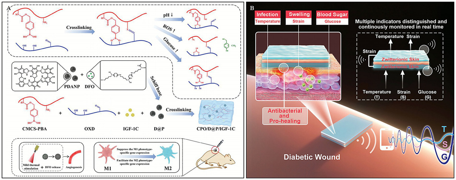 In chronic DWs, persistent high glucose levels and the inflammatory environment impede the normal wound healing process. Dai et al. (109) engineered a sophisticated multi-responsive platform by constructing a dynamic network crosslinked via Schiff base and boronate ester bonds. Leveraging the pH-sensitivity of these dynamic linkages (mechanisms detailed in Section 3.2), the hydrogel undergoes programmed degradation upon exposure to the acidic diabetic wound microenvironment. This distinct dual-dynamic strategy not only ensures structural adaptability but also synergistically facilitates the release of bioactive agents, thereby modulating macrophage polarization. The study demonstrated that the hydrogel enhanced angiogenesis by upregulating the expression levels of angiogenesis-related factors, such as hypoxia-inducible factor-1α (HIF-1α), vascular endothelial growth factor (VEGF), CD31, and α-SMA. This significantly accelerated wound healing in streptozotocin (STZ)-induced diabetic mice. This multi-responsive, multifunctional hydrogel provides a locally specific, dual-responsive drug release strategy for diabetic foot ulcers.