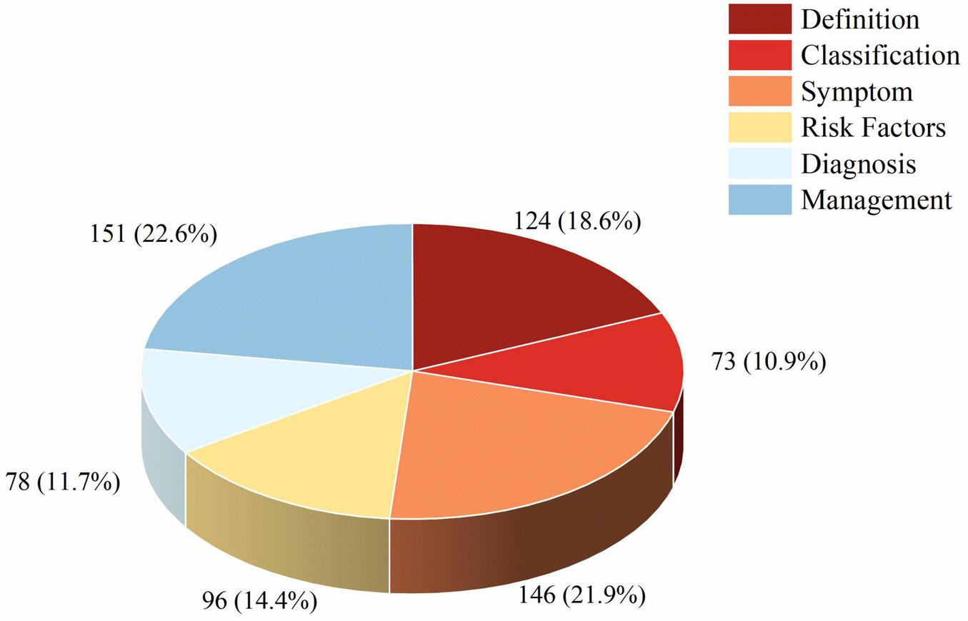 We analyzed the thematic content of 196 included videos, noting that many of them covered multiple topics simultaneously. As shown in Figure 2 and Table 2, the most frequently mentioned topic was Management (n = 151, 22.6%), followed by Symptoms (n = 146, 21.9%). In contrast, Classification (n = 73, 10.9%) and Diagnosis (n = 78, 11.7%) were the least frequently addressed. Definition and Risk Factors accounted for 18.6% (n = 124) and 14.4% (n = 96), respectively. These findings indicate that the videos tend to focus more on symptoms and management, which are of primary concern to patients, while professional definitions and diagnostic aspects are less frequently discussed.